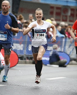 Posledních sto metrů. Ve finiši prohrávám o jedinou vteřinu s klukem v oranžovém tričku, co jsme vedle sebe stáli na startu. Tak nám ty časy hezky vyšly :-). Oficiálně to mám přesně za hodinu a čtyřicet minut. Jinak 1:39:33 hod. Bylo to nádherné. Dala bych si to ještě jednou. Co jednou, minimálně tak stokrát ještě :-).