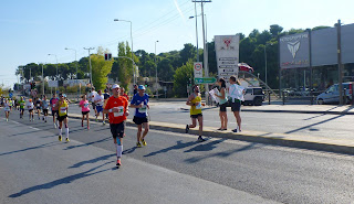 21. km. půlka za mnou za 1:45. Super, jde to líp než jsem čekal. Tak ještě jednou tolik a jsem v cíli. Na cíl se moc těším, je přímo v antickém Panathenaic Stadium. Stadion byl v 19. století rekonstruován a roce 1896 hostil první moderní Olympijské hry a stejně tak ty poslední řecké v roce 2004. Včera jsme se tam byli podívat a je to fakt impozantní stavba, z které dýchá historie a atmosféra gladiátorské arény. Až budou i plné tribuny, tak to bude určitě hodně silný zážitek.