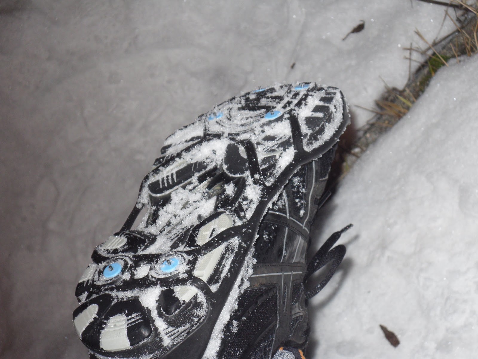 A teď mě čekala ještě cesta v naprosté tmě. 🙂 Nasazování nebylo nejsnazší. Nejdříve sundat batoh a najít baterku, abych si posvítil do batohu. Hurá, nesmeky jsem rychle našel a teď je nazout. Co Vám budu povídat, chvíli mi to trvalo. Člověk si sice odpočinul, ale také pěkně vymrznul. Několikrát jsem zkontroloval, zda nesmeky dobře drží na botách a pozvolna se začal dostávat zase do běžeckého tempa.