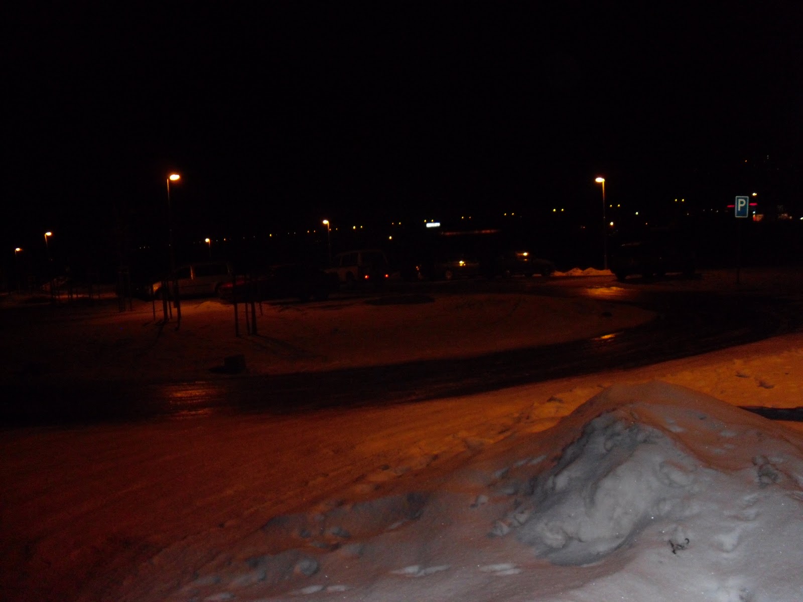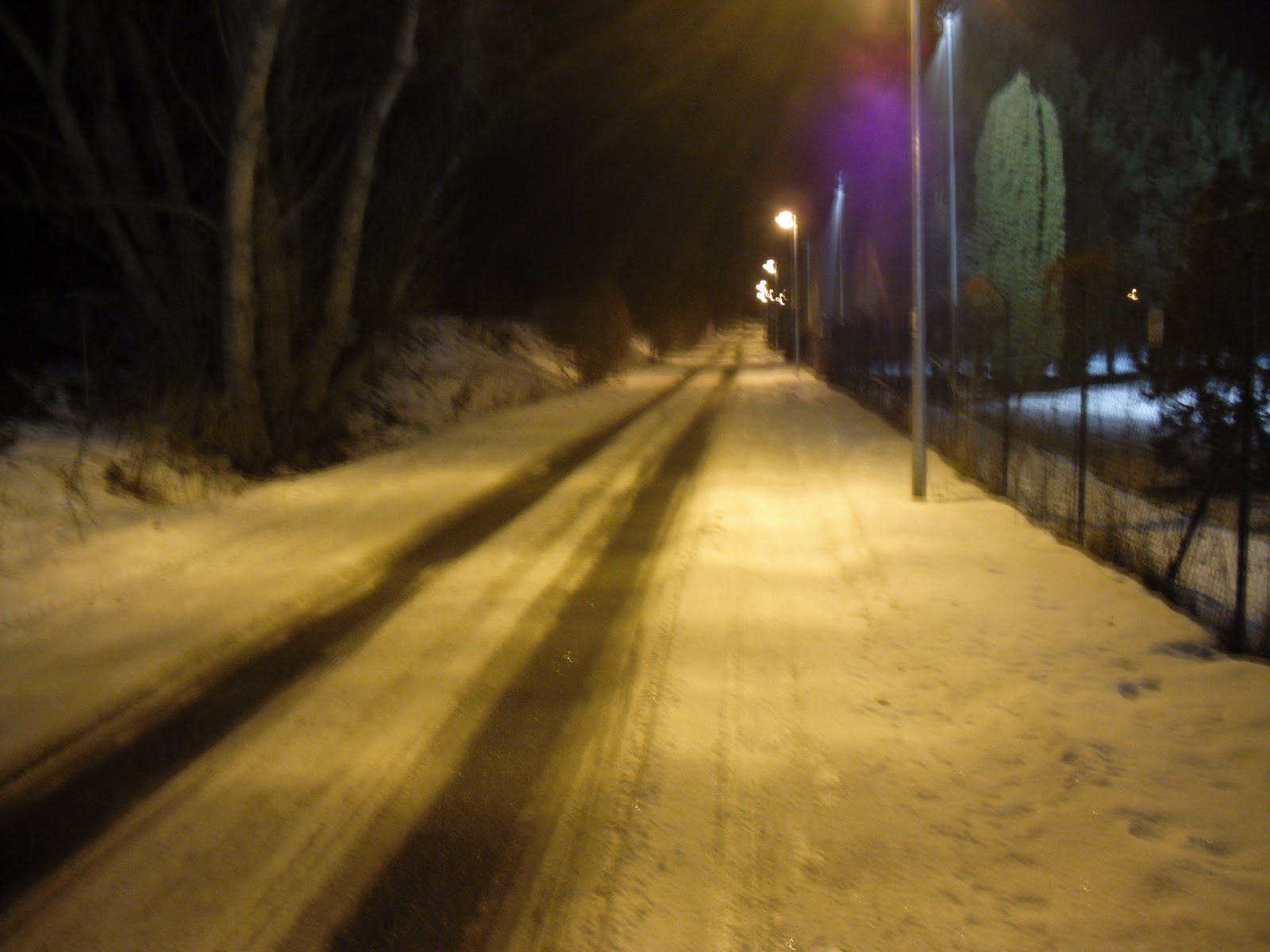 Silnice u golfového hřiště či co to je (myslím, že tam jsou dvě, teď jsem u toho prvního) mě sice pořád uchvacovala tím, že je zasněžená, ale také byla poměrně kluzká. Po výběhu mírného kopečku jsem se rozhodl nasadit nesmeky. Nohy nebyly jisté a boty docela klouzaly, jasný důvod je použít.