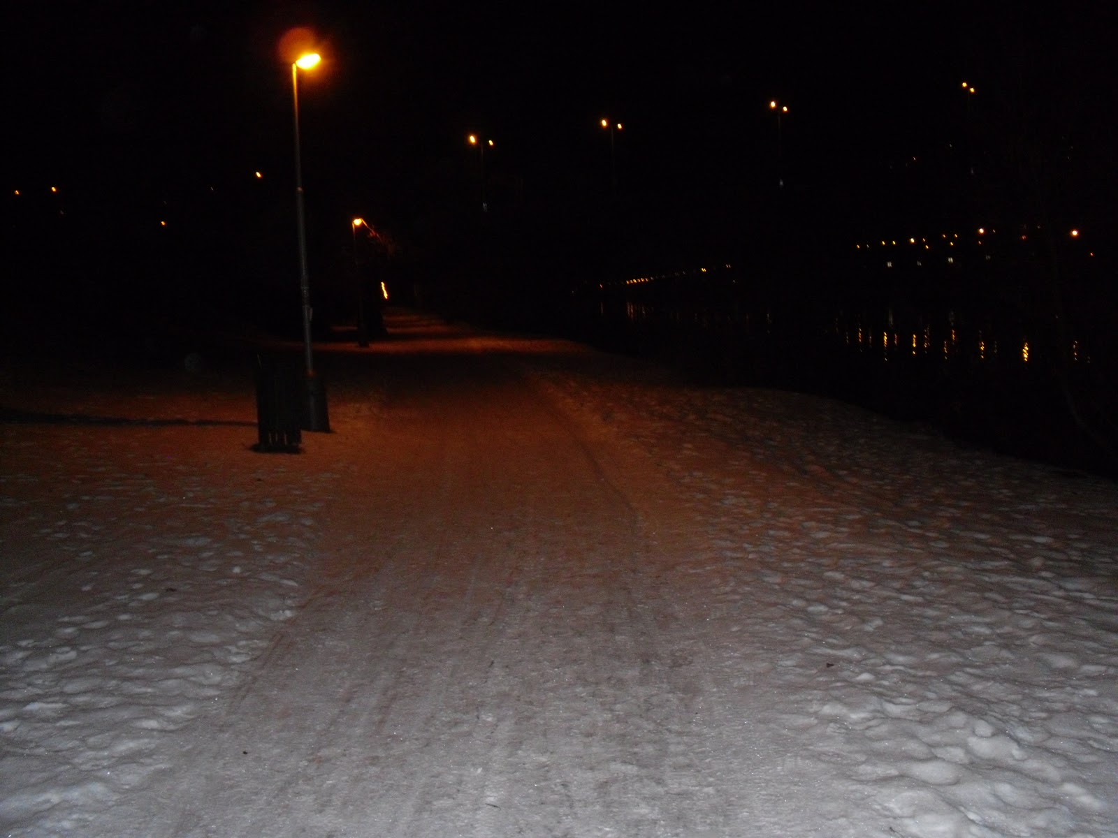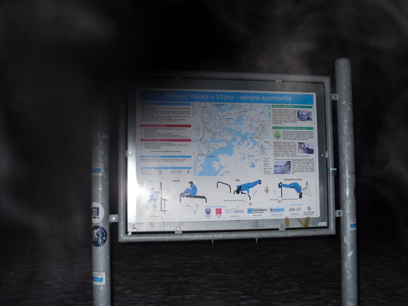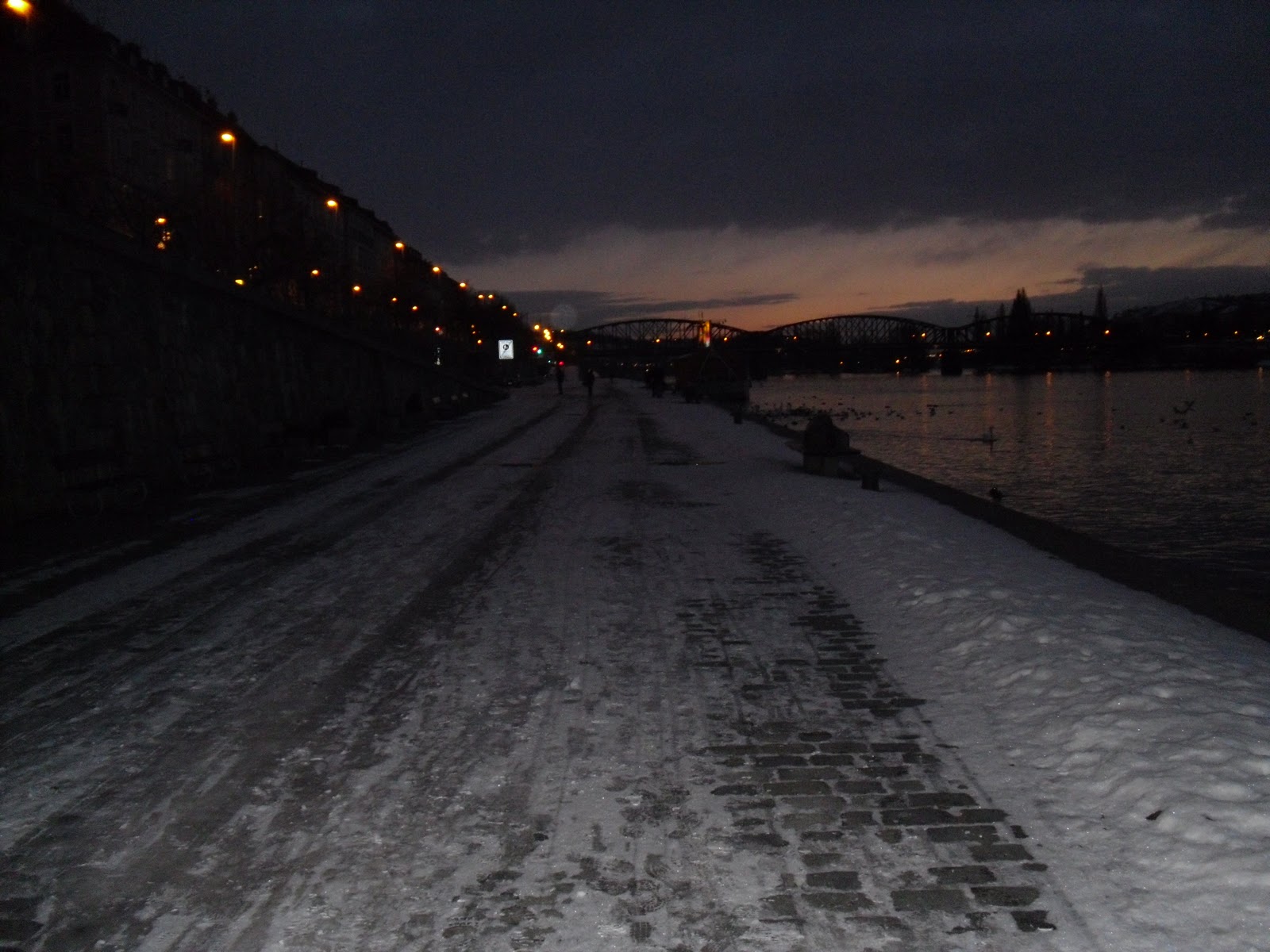 Tady občas na mě padají chmury, nikde ani živáčka, jen Vy sám, sníh, vpravo voda, vzdálené mosty a na pravém břehu Vltavy vidíte velmi vzdálené kužele zářících světlometů automobilů. Pečlivě sleduji okolí, zda se tu nepohybují nějaká individua, občas se ohlédnu zpět, ale většinou mě překvapí ženy s kočárky. No sakriš, tak sem bych se teda jako žena s kočárkem osobně hodně bál! Některé chodce spatříte až na poslední chvíli, zdají se Vám totiž jako jeden z mnoha tmavých stínů. Nejsou vůbec osvětlení a ani si neuvědomují, že byste je mohl také přehlídnout. Při běhu to není ani takový problém, ale na kole je to nebezpečné.