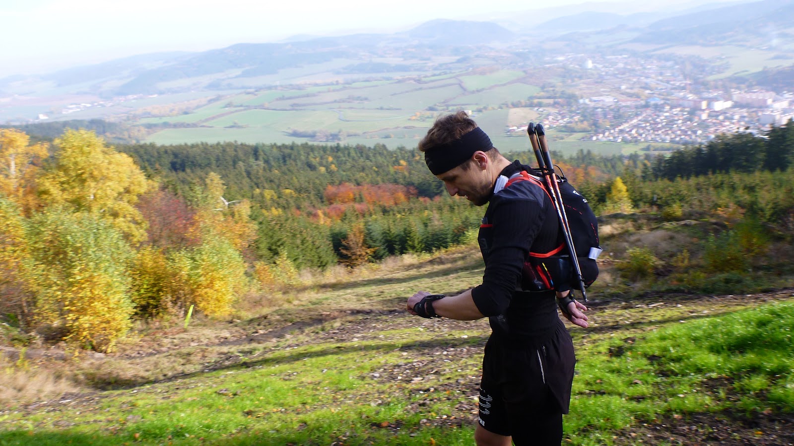 No ty woe. To mi tím mým kufrování pěkně cukli. Radši se zvedám a vyrážím dál. Nejdřív sám, ale protože zase někde ztratím cestu a potřebuju si utáhnout boty, dobíhají mě kluci se psem. Je tu nějaký stoupání, tak vytahuju moje z-pole hůlky Leki. Standardním škubnutím chci napnut vnitřní lanko a složit je, ale jak šubnu z jedné hole mi upadne spodní díl.