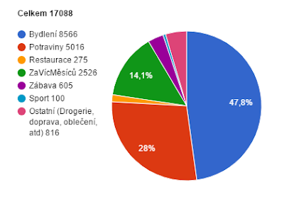 Je to o něco víc než minulý měsíc, ale ty zásadní položky jsou v zásadě stejné. Menší náklady na restaurace, o to větší na nákupy surovin. Rozdíl dělá asi hlavně koupě many na dlouho dopředu. Se sportem jsem se oproti minule rozšoupla, jsou to dva vstupy na acrojam. Kromě toho dál běhám: hlásím 36 Km za pět výběhů. V zábavě je hlavní položka vstupenka na Fénix festival. Navíc oproti minule je nejasná položka ZaVícMěsíců, kam si píšu náklady, které se ze své podstaty mají rozložit. Tohle je nedoplatek na plyn a revize kotle. Poplatky do další zimy zoptimalizujeme. Pokud víte, jak zoptimalizovat revizi, dejte vědět.