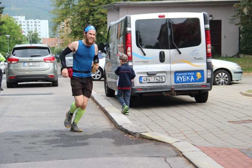 Petr fotil, bavili jsme se, já ještě cháloval banány a připravoval ledvinku. Letos po nehodě s batohem na CUTT jsem chtěl běžet opravdu na lehko. S jednou půl litrovou flaškou v ledvince a druhou v ruce. V kapsách od ledvinky jsem měl pak akorát pár tyčinek, solné tablety, tři tuby magnézia a pohotovostní balíček papírových kapesníků, proti kohoutkové vodě. Občerstvovačky jsou stejně zhruba co 14km. Venku před areálem jsem se pak rozklusával a potkal jsem oba Gajárky. Dělali si ze mě čurinu, že běžím radši dřív, abych měl náskok….gauneři….