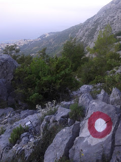 Beru batoh s vakem a dva litry vody, tři müsli tyčinky a vyrážím co nejdříve (teda 6:30 zase tak brzo není). První dva kilometry do Topići se dají běžet, pak začíná chodecká pasáž. Naštěstí ráno je úbočí ve svém vlastním stínu, takže na sluníčko se dostanu až když už jsem cca 1000 metrů nad mořem a není tam takové vedro. Postup je ale pomalý, je mi jasné, že to budu muset zkrátit. Vyškrábu se na hřeben na sousední vrchol (1619 m.n.m.). K vytyčenému cíli zbývá tak jeden km po hřebeni a cca 50 výškových metrů. Protože mám trochu časový skluz oproti plánu, tak to otáčím a peláším zpět. Terén je ale opravdu náročný, o čemž svědčí i tempo nahoru jsem měl 23min/km a dolů 16 min/km. Cesta vede po šutrech ostrých jako žiletky, zničil jsem si na nich boty. Pravda byly to silničky a na něco takové asi nebyly dělané, ale kameny jim z podrážky úplně odřízly některé části a to co neupadlo cestou, se dole už jen bibmalo na malém kousku gumy. Trochu mě to mrzelo, boty měly naběháno teprve 1000km a nějakých 600 mohly ještě vydržet – moje chyba.
