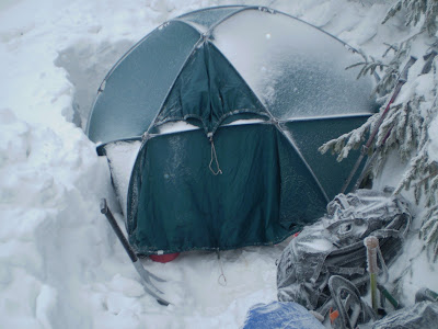 Spíme pod stanem a usneme hodně brzo, ráno sněží a je mlha. Všechno ve stanu je vlhké. Obout na kost zmrzlé boty a sbalit mokrý stan. Čeká nás už jen cesta domů.
