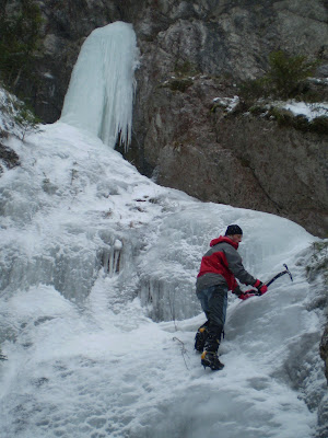 Logika je to trochu zvrhlá, protože místo lehkého startu jsme vylezli po zamrzlých kaňonech Dier až na Malý Rozsutec, po tmě sešli do Zázrivé pořádně strmý svah a pak si dali na zahřátí pochod po asfaltce asi až do desáté večerní. Výživný a dlouhý den. A začal hodně vtipně – na úvod jsme si dali sprint s bágly z vlaku na autobus, který nám stejně ujel. Jeli jsme tedy dalším autobusem do vesničky Varín, kde jsme podle plánu měli předjet autobus do Terchové a nasednout do něj. Ale mohli jsme mu jen zamávat, když jel kolem nás. Asi hodinu jsme mrzli na zastávce v poryvech větru – to mi byla asi největší zima za celý výlet. Když jsme konečně dojeli do Terchové, tak jsem zjistil, že mám rozbitou trekovou hůlku. U místního domorodce s dřevorubeckými svaly jsme se ji snažil spravit půjčenými kleštěmi a hasákem. Pán chvíli pozoroval naše marné snažení, pak vzal do ruky nářadí a uštípl mi pěkný kus hůlky a s omluvným úsměvem nám ji vrátil…