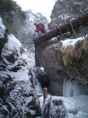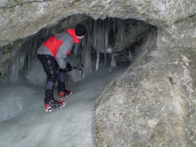 Pak ale konečně byla civilizace za námi. Vydali jsme se do hor. Do soutěsek Horné a Dolné diery. Cesta, kterou jsme se dali, vede vápencovými tiesňavami až do sedla mezi Malý a Velký Rozsutec, nádherně rozeklané hory. V létě jsou v dolinách lávky a žebříky, teď ale bylo všechno pokryté ledem. Hlavně horní soutěska. Ledopády, rampouchy, zamrzlé žebříky. Z šedého nebe se sypal sníh. Kubovi padaly z bot mačky, tak si je co chvíli spravoval. Než jsme vylezli na louky v sedle Medzirozsutce, tak jsme se nasmáli až nás bolely břicha, užili si ledu a den se přehoupl do druhé poloviny. Velký Rozsutec byl celý v mracích, Malý občas vykoukl. Protože jsme měli v plánu přejet zítra do Nízkých Tater, tak jsme se vyškrábli jen na menší Rozsutec (1343 m n.m.) – krásné skalisko, trčící většinou do mlhy – a rychle se vydali do údolí. Tma se chystala zahalit hory.