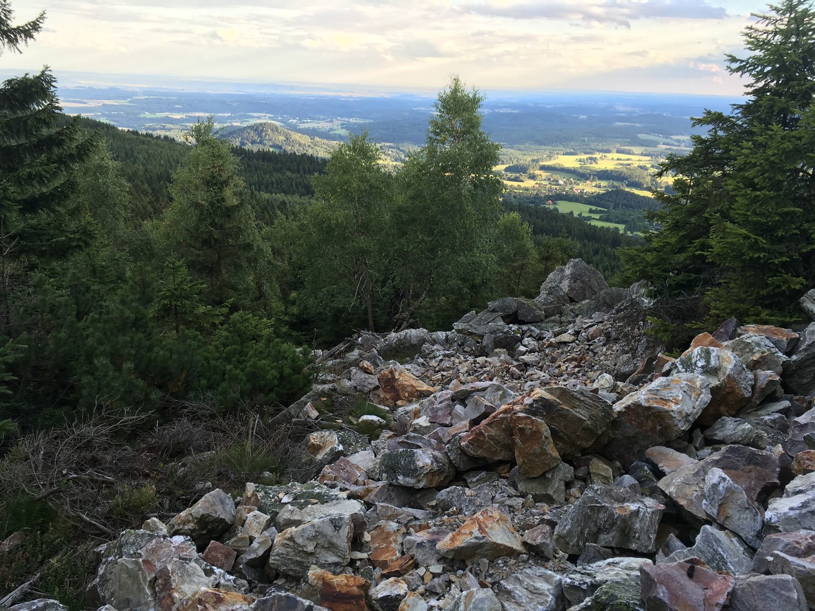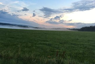Jenže se blíží studená fronta.. Déšť a silná bouřka. Analyzujeme vzdálenosti mezi vesnicemi a čas mezi zábleskem a zvukem hromu.. MM nás uklidňuje, bouřka je daleko., stihneme minimálně ještě jednu/dvě vesnice (2-4km). Než stačíme rozebrat, jak to je, 31s mezi zábleskem a hromem se smrsklo na 10s začíná pršet. Kde se vzal tu se vzalo pár domků, pod přesahem jedné střechy se celkem marně snažíme schovat.. MM ukazuje sílu svých zkušeností: odbíhá do deště — objevil totiž nedalekou osvětlenou budovu WC v kempu:), kam se přesouváme i my.. U horkovzdušného ventilátoru na ruce si moudře suším svoje tričko, celkově asi hodinu čekáme .. A pak ztuhlé a trochu prochladlé tělo rozbíhám, zahřívám..kochám se ranními mlhami..Bouřka nás zdržela, ale před sedmou jsme na základně:), rychlá sprcha, TB nás hostí teplou polévkou, čajem.. Bereme auto a střídavým řízením se relativně snadno dostáváme do Prahy..MM mi potom prozradil, že jeho efektivita během dne klesla asi na 1/3, já se domnívám, že to u mě bylo stejné a v určitých fázích i horší. Jak jsem četl nějaký delší (komplikovanější) text, tak jsem se musel několikrát vracet a pokud jsem se potřeboval zamyslet, hrozil mi vždy mikrospánek. No jo.. stáří!:)