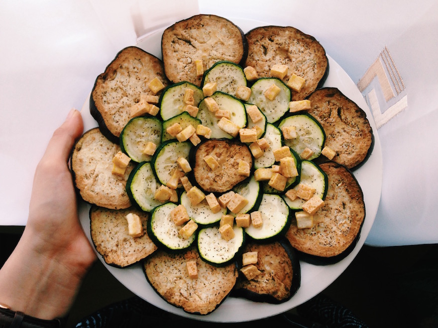 Dnešní oběd – grilovaný lilek, cuketa a tofu na kokosovém oleji.