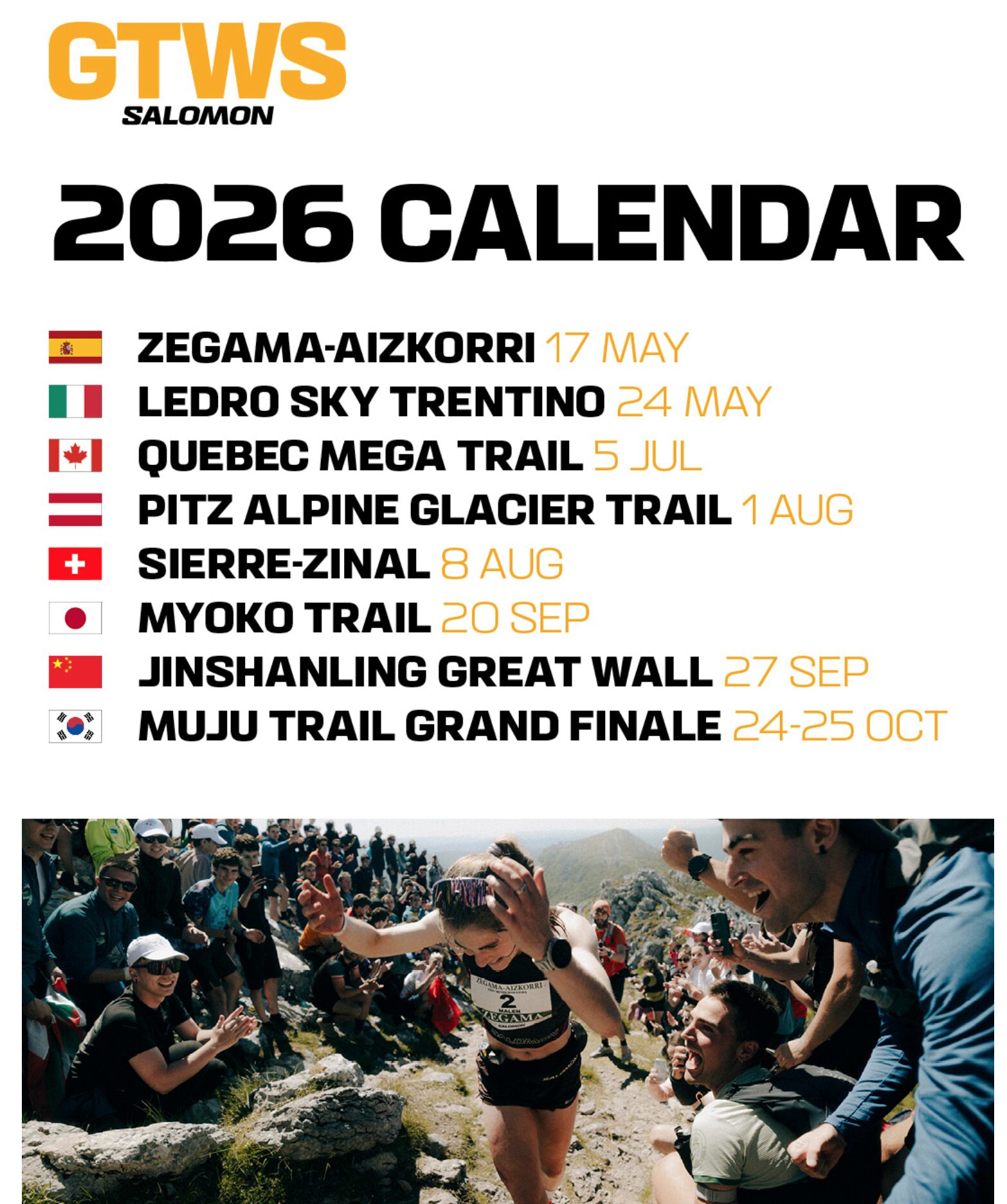 Závěr sezony 2026 pak přinese premiéru v Jižní Koreji – Grand Finále na Muju Trail. Závod se odehraje v srdci korejské kandidatury na Letní olympijské hry 2036. Trať nabídne sled hřebenů, strmé sklony a vysoce technické stezky vedoucí jehličnatými lesy a skalnatým terénem, kolem starobylých buddhistických chrámů a krajin, které odrážejí nejautentičtější charakter země.
