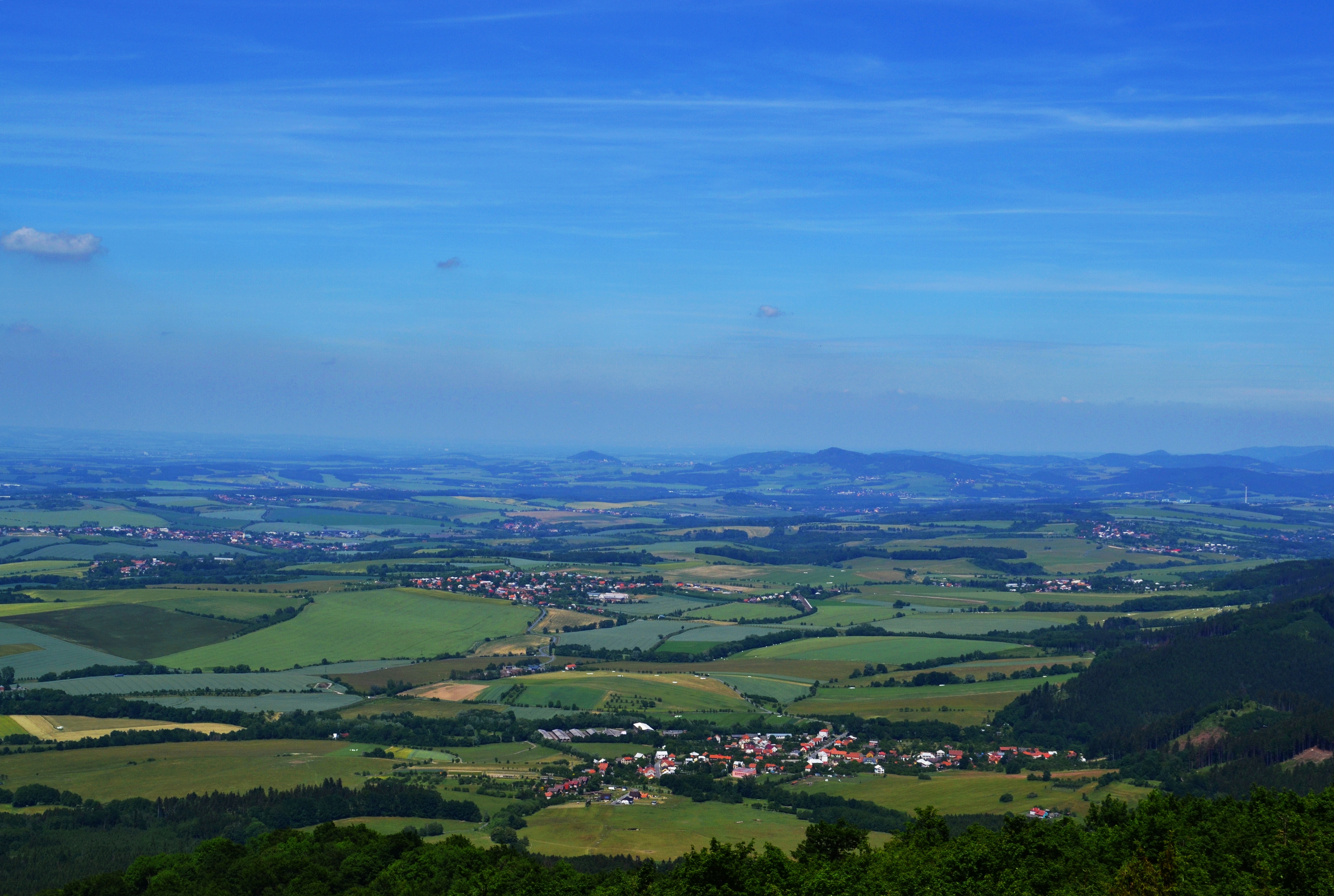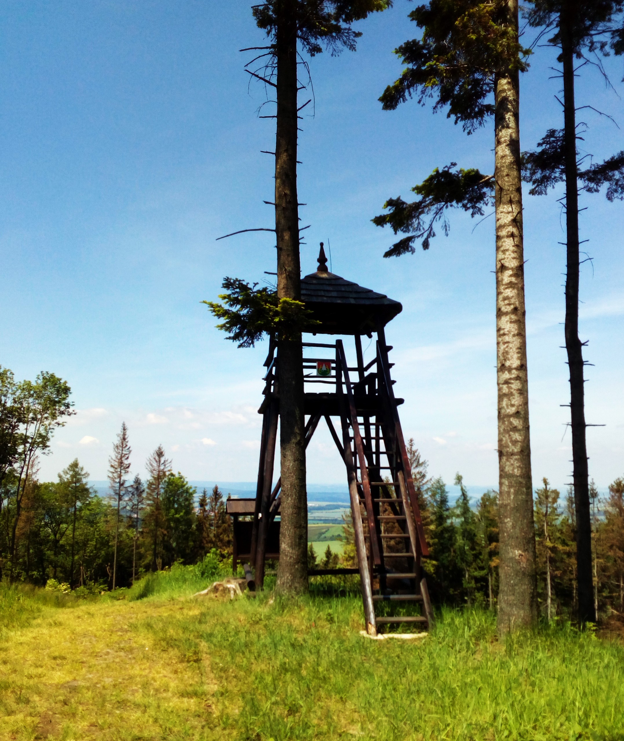 Na kopec jsem pokračovala polní cestou, neznačenou, ale hlavně že byla. Sice vedla přes soukromé pastviny ale býci nikde, jen z dálky se ozývaly ovečky, tak stačilo přelézt nadvakrát plot. Nad loukou na vyhlídce u informačí tabule, kde začíná naučná tezka, jsem si dala delší pauzičku na lavečce, abych trochu dobila baterky sobě i hodinkám. To už mi bylo opravdu vedro, ale musela jsem vydržet a naštěstí byl pak kousek lesem. Rozhlednu na kopci jsem nejdřív nemohla najít, protože jsem hledala na místě, kde byla zřejmě kdysi a na mapách je tam stále. Ale nebylo po ní ani památky. Už jsem si říkala, že tedy ani tato vyhlídka nevyjde, ale jak jsem běžela dál, po pár desítkách metrů se objevila. Maličká rozhledna, s výhledem převážně na severozápad, na druhou stranu bylo dost stromů. Za jedním z nich byl ukryt i vrchol Kelčský Javorník, na který jsem mířila. Snědla jsem pár datlí a seběhla do Podhradní Lhoty, odkud už začínalo další stoupání. Přes zříceninu Šaumburk, ze které toho ovšem moc nezbylo, po zelené značce na Kelčák. No stoupáky pěkné ale byla jsem za půlkou a zbývaly mi už jen dva větší. Cestou jsem nepotkávala až tolik turistů, jen sem tam cyklista, ale na Kelčském Javorníku už jich pár bylo. Naštěstí jsem stihla vylézt na rozhlednu dříve, než se z lesa začal po kouskách trousit další školní výlet.