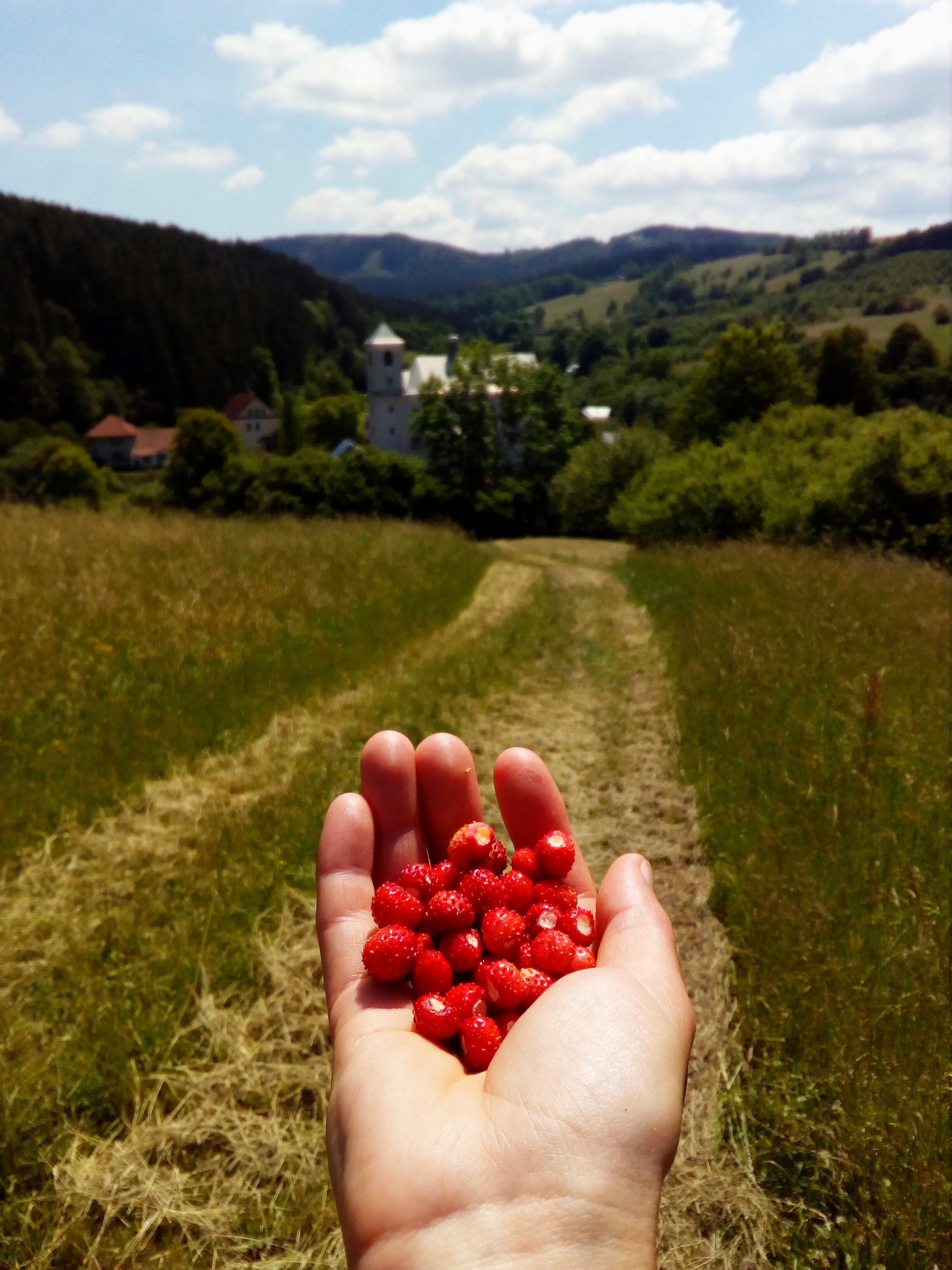 V Rajnochovicích jsem měla nějakých 19-20km v nohou a vedro už začínalo být znát. Nechtěla jsem moc městem, takže od kostela hned do polí směrem na Kunovickou hůrku, kde byla další rozhledna. Cestou zase trošku focení…výhledy, kytičky, kostelík…a občerstvovačka, když mi pod nos zavoněly lesní jahody… nasbíraná hrst mě pěkně osvěžila. 🙂