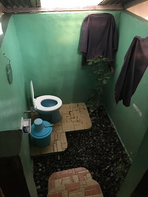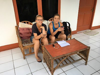 Už na letišti v hale na zavazadla si k nám přisedl místní týpek a začal se vyptávat kam jedeme, jak jedeme atd. Nakonec jsme se nechali přemluvit a za 50 000 indonéských rupií ( 90 kč) nás řidič odvezl asi 20 km do vesnice, kde jsme se chtěli ubytovat. Tip na ubytování jsme dostali od kolegyně, přišli jsme na dvorek plný slepic, kuřat, prasat a koček a vyhlíželi majitele. Přišel usměvavý chlapík s celkem ucházející angličtinou a domluvili jsme se, že zůstaneme 2 noci. Ubytování bylo prostě ale autentické. Domečky z bambusu na nožičkách, se studenou vodou a místní kuchyní paní domácí.