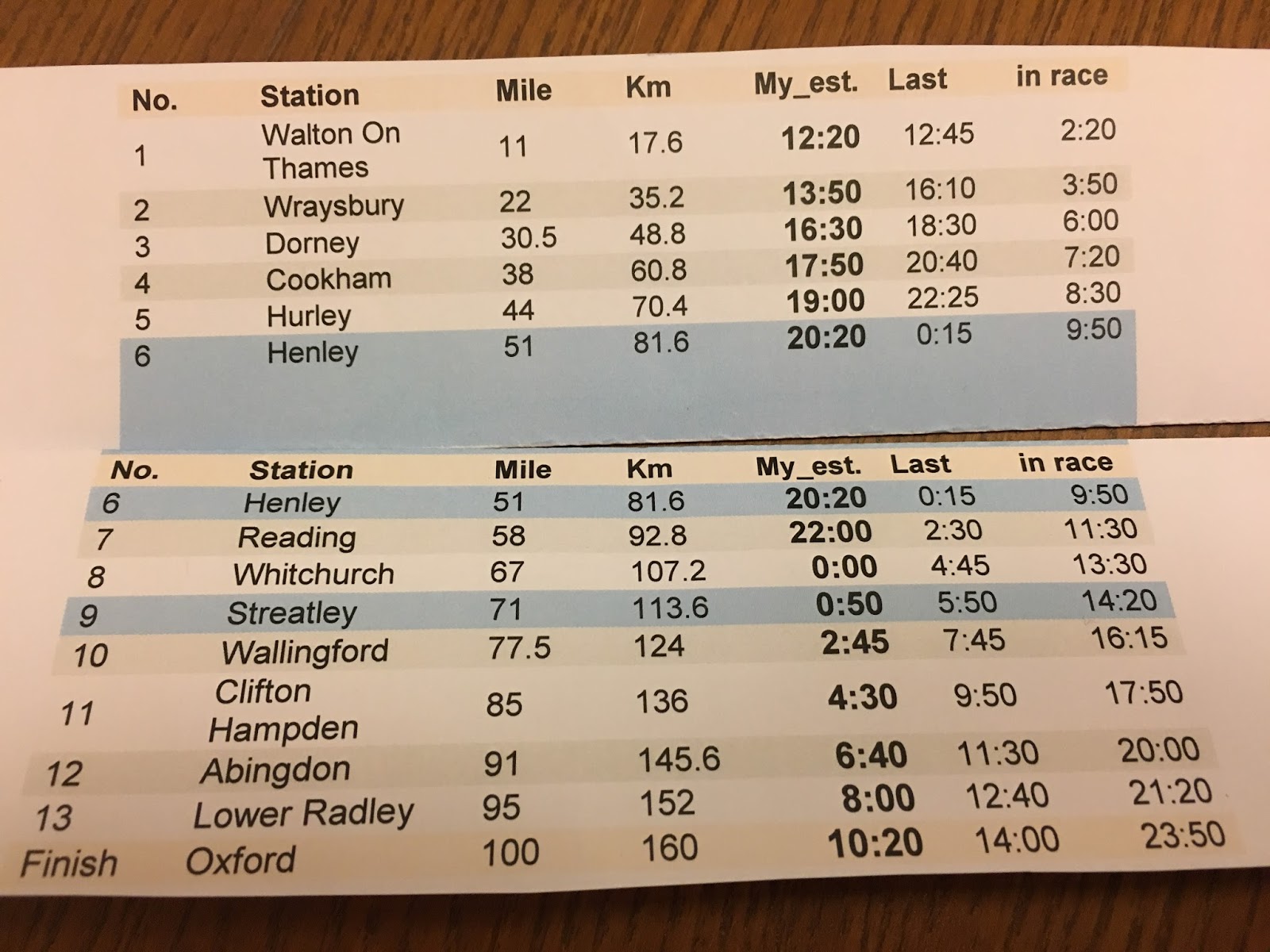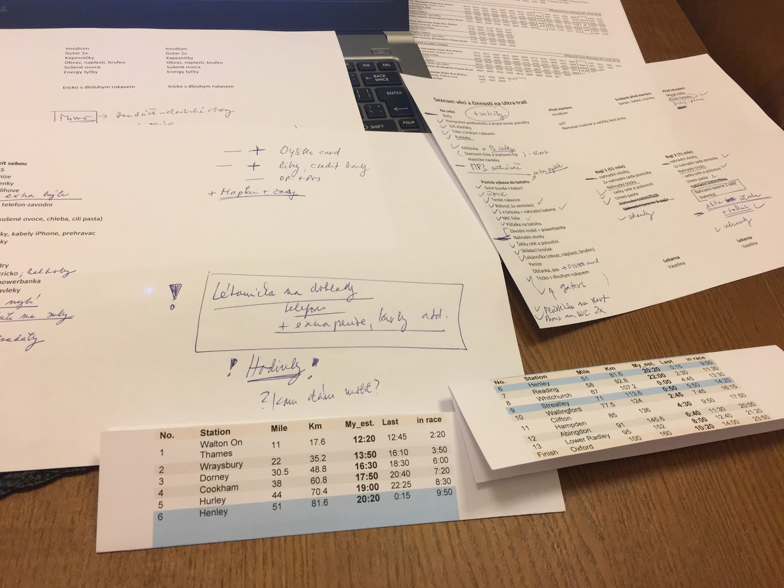 Pak už se startuje, stoupám si blízko ke konci, ale ne zase úplně nakonec. Vím, že trať je relativně úzká, nechci se nikomu plést, ale přeci jen předbíhání velkého počtu lidí může stát zbytečně sil. Mám z domova asi tři „taháky“ [tradiční výroba na papíru, olepené izolepou], koukám se na ně a žasnu. Na prvních 17 km jsem si dal limit 2:20, na dalších 17 km už jen 1:30. Evidentně můj Excel nebyl ve formě:). A tak si připomínám rady svojí trenérky, zastrkávám papírky hluboko do kapes (nakonec jsem je stejně někde i ztratil) a .. běžím naprosto podle pocitů. No jasně, počítám si podle hodinek (a odhadů svého současného stavu) za jak dlouho asi můžu být na další stanici, ale žádné přesné plány. Jediný průšvih je, že trať je celkem rychlá. To není jako v horách, kde člověk chvíli běží, pak je kopec, nebo technický úsek.. a dá se odpočinout. Kdepak! Tady je to (s výjimkou mostů) pořád silně běhatelné.. Tady platí to K+M+B .. Ku*va Musíš Běžet! 🙂