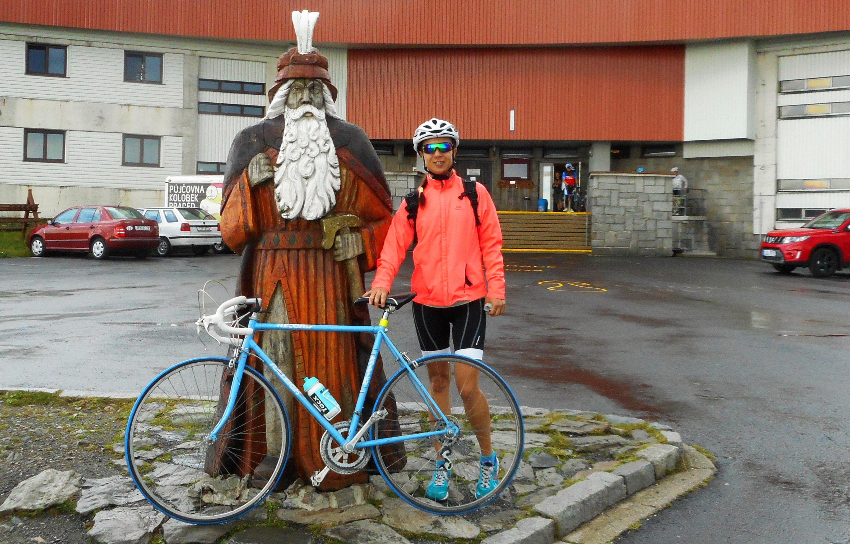 Šlo to sice pomaleji ale ráno alespoň nebyl takový provoz a ani vedro. Vzhledem k tomu jaká byla předpověď, jsem mohla být ráda že mi začalo pršet až z Hvězdy na Ovčárnu- připadala jsem si trošku jako blázen-v dešti na silničce na Praděd ale nakonec jsem tam dojela a málem i s ovacemi na vrcholu. Měla jsem krapet zpoždění, takže jsem dala jen čaj, kus buchty a převlékla si suchý triko. Vrcholové foto a frčíme dolů.