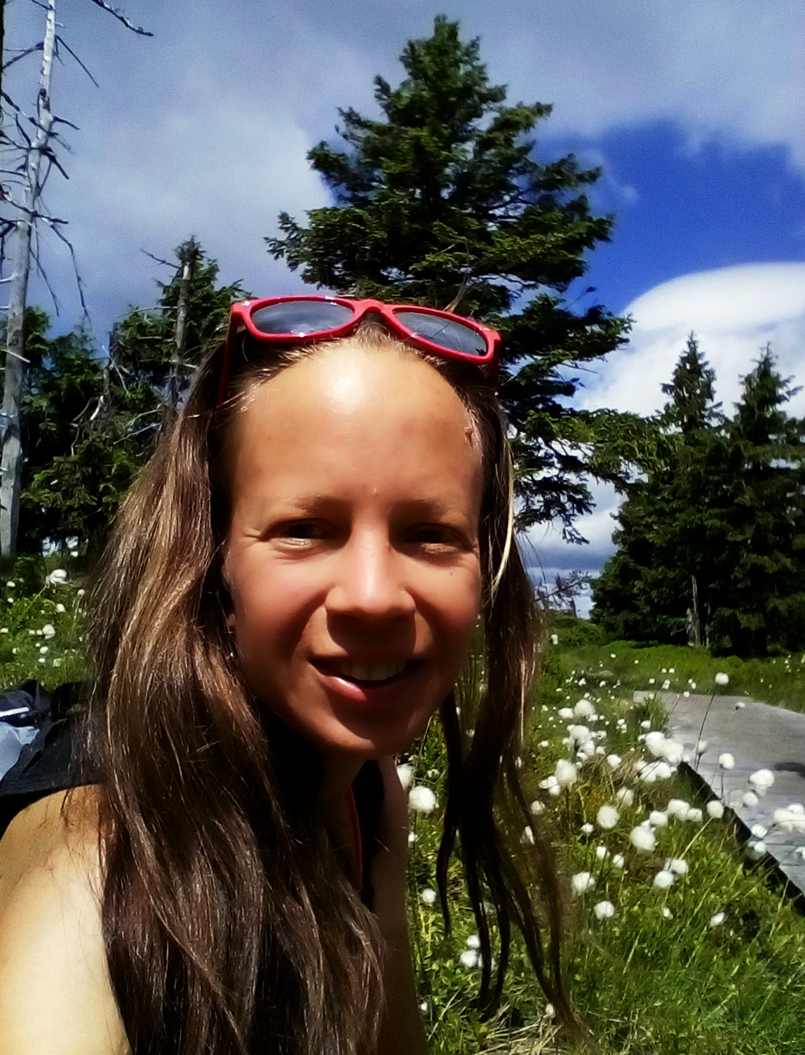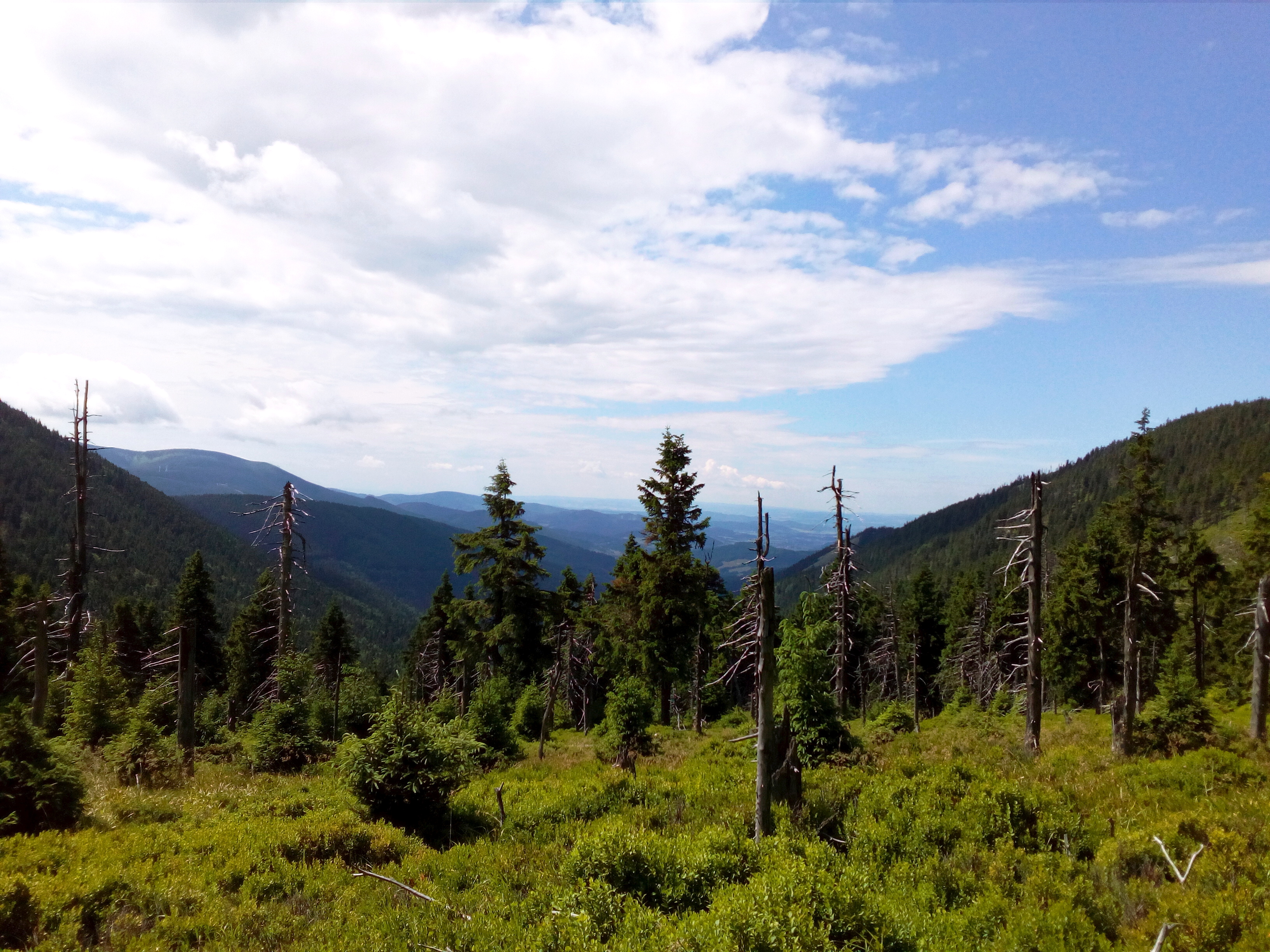Po půlmaratonu jsem si sice dala v neděli odpočinek ale další den už jsem šla vyklusat a další den taky a pak taky, až jsem v pomalejší tempu proběhla celým týdnem… nebylo to moc ale rozhodně se to nedalo počítat jako volnější týden. Měla jsem stále nějakou divnou náladu a hlavně žádné pořádné plány na léto. Měla jsem jet do Tyrolska k tetě ale u nich se letos dveře netrhnou a tak na mě nezbyl vhodný volný termín. Musela jsem se jet "vyběhat" do Jeseníků. Tentokrát jsem nebrala zrcadlovku, jak jsem si slíbila minule na Hostýnkách, stejně by uspěchané fotky stály za prd. Jela jsem do Koutů na devět hodin, takže jsem ani nijak ráno nespěchala. Ráno bylo slunečno i když celkem chladno. Celý den se honily mraky a nakonec jsem i šustku oblékla, byť spadlo jen pár kapek. Vzala jsem to po žluté kolem Hučivé Desné, běželo se mi dobře, takže jsem ušetřila dost času a zastavila až na oblíbeném místě u vodopádu, kde žlutá začíná stoupat prudčeji. Přestože bylo chladněj, šla jsem se opláchnout, ale tentokrát mi voda byla až nepříjemně studená a měla jsem trošku strach o srdce, takže rychle ven. Dokonce mi pak byla zima a musela jsem obléct vestu a chvíli sedět na kmeni a sníst ještě aspoň banán, abych doplnila energii. Mezitím mě dohnal chlapík, který šel od vlaku stejnou trasu. Ale jak jsem se vzpamatovala zase jsem ho ve stoupání předběhla a pak jsme se potkali ještě jednou. Původně jsem chtěla jen vylézt na Vozku a pak přes Vřesovou studánku zpátky ale šlo to dobře a počasí bylo příjemné.