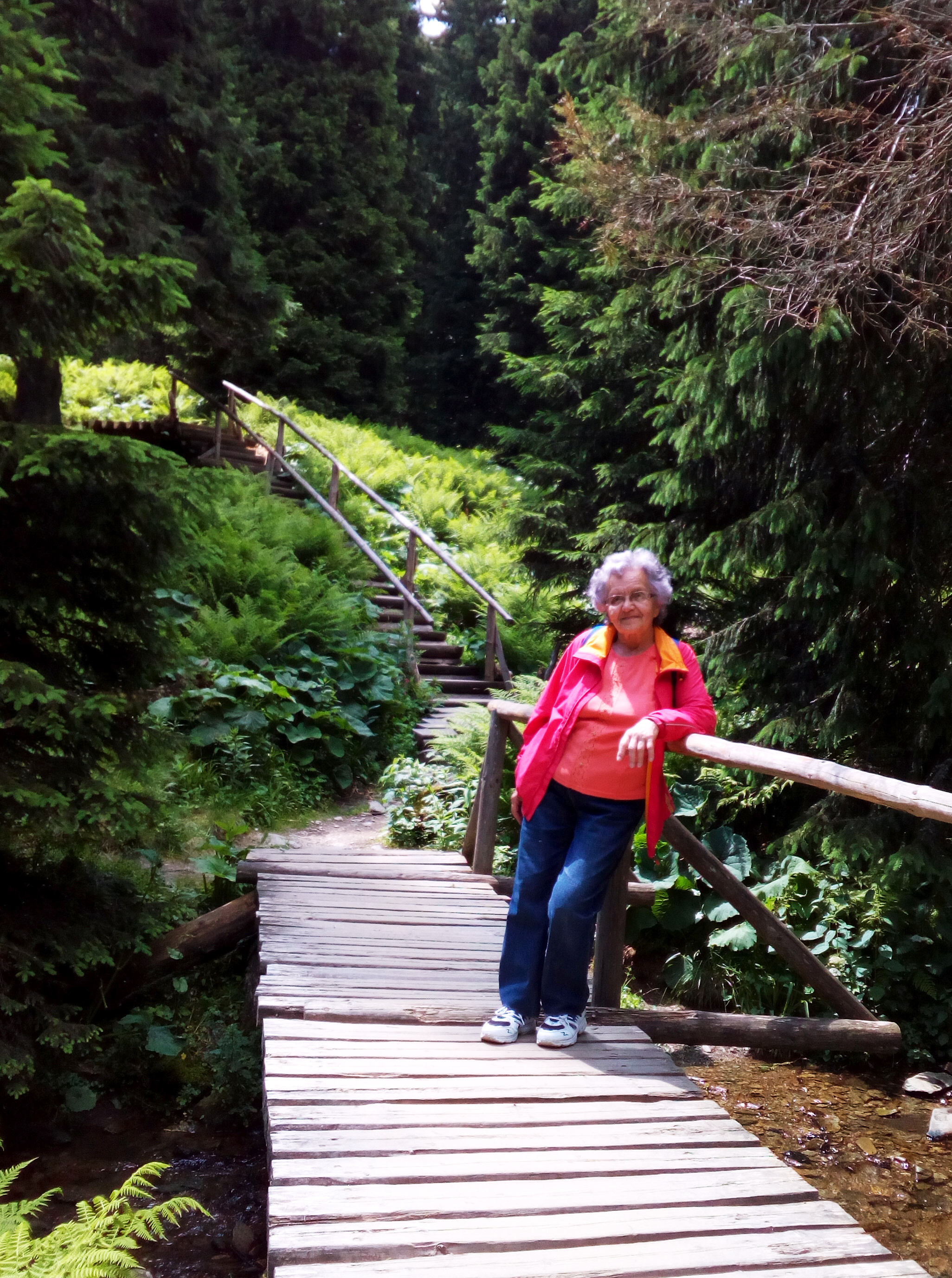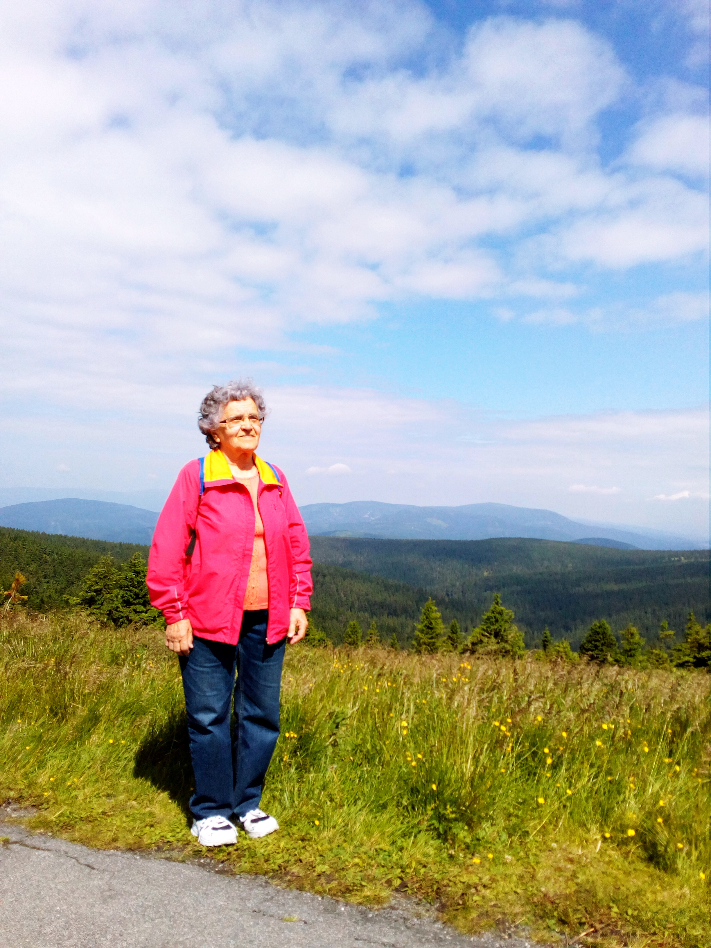 Využily jsme přímého autobusového spoje, který jezdí ve svátek o víkendu, a dojely s ním až na Ovčárnu. Pro mě to bylo vyjímečně, protože si raději vyběhnu odněkud zespodu, ale to jsem pochopitelně nemohla chtít po mé 84 leté babičce, která je jinak ještě celkem v kondici, protože jezdí hodně na kole a občas ji vytáhnu na nějaký pěší výlet. Na Ovčárně nás autobus vyplivl mezi klasické sváteční davy, které se naštěstí celkem rozptýlily. My jsme šly pomalu, ale zase nee tak jako třeba ti s dětmi nebo s kočárky. Je to sice takové o nervy, ale jednou za čas to člověk přežije. Počasí celkem vyšlo, tedy alespoň nepršelo. Na Praděd jsme došly za necelou hodinku, když nepočítám přestávky na vyhlídkách. V restauraci bylo celkem plno, ale dvě místa ještě pro nás byla, a venku foukalo, tak bylo vevnitř příjemněji. Daly jsme kávičku a já i bublaninu, protože mám nějaké rychlejší spalování a už mi kručelo v žaludku. Bublaninu z domu jsme ještě pošetřily a snědli ji pak u Barborky. Tam jsme šly dolů z Pradědu (pořád po silnici) hlavně proto, že autobus jel zpátky až 15:30 a měly jsme tak fůru času, že jsem netušila vůbec jak ho využijeme. Takže u Barborky venku na lavičce další přestávka, na sluníčku, s bublaninou. Koukla jsem na mapu ale prostě Jeseníky nejsou park, takže nic moc jednoduchého na procházení tu nebylo. Tak jsem nakonec přesvědčila bábi, že sejdeme cca kilometr pod Barborku, po modré k rozcestí Pod Ovčárnou, a pak nějak vylezeme ten kilometr po žluté k Ovčárně. Bylo to náročnější, hlavně proto, že nahoru šly Bílou Opavou davy turistů. Taky zde jsou různé kořeny a kameny a stupně, takže jsem občas vedla bábi za ruku, ale celkem se to dalo. Dokonce jsme potkaly známého, což byla milá náhoda. Stoupání na Ovčárnu už tak přelidněné nebylo, ale šlo to taky pomalu, přecijen to bylo dost do kopce.