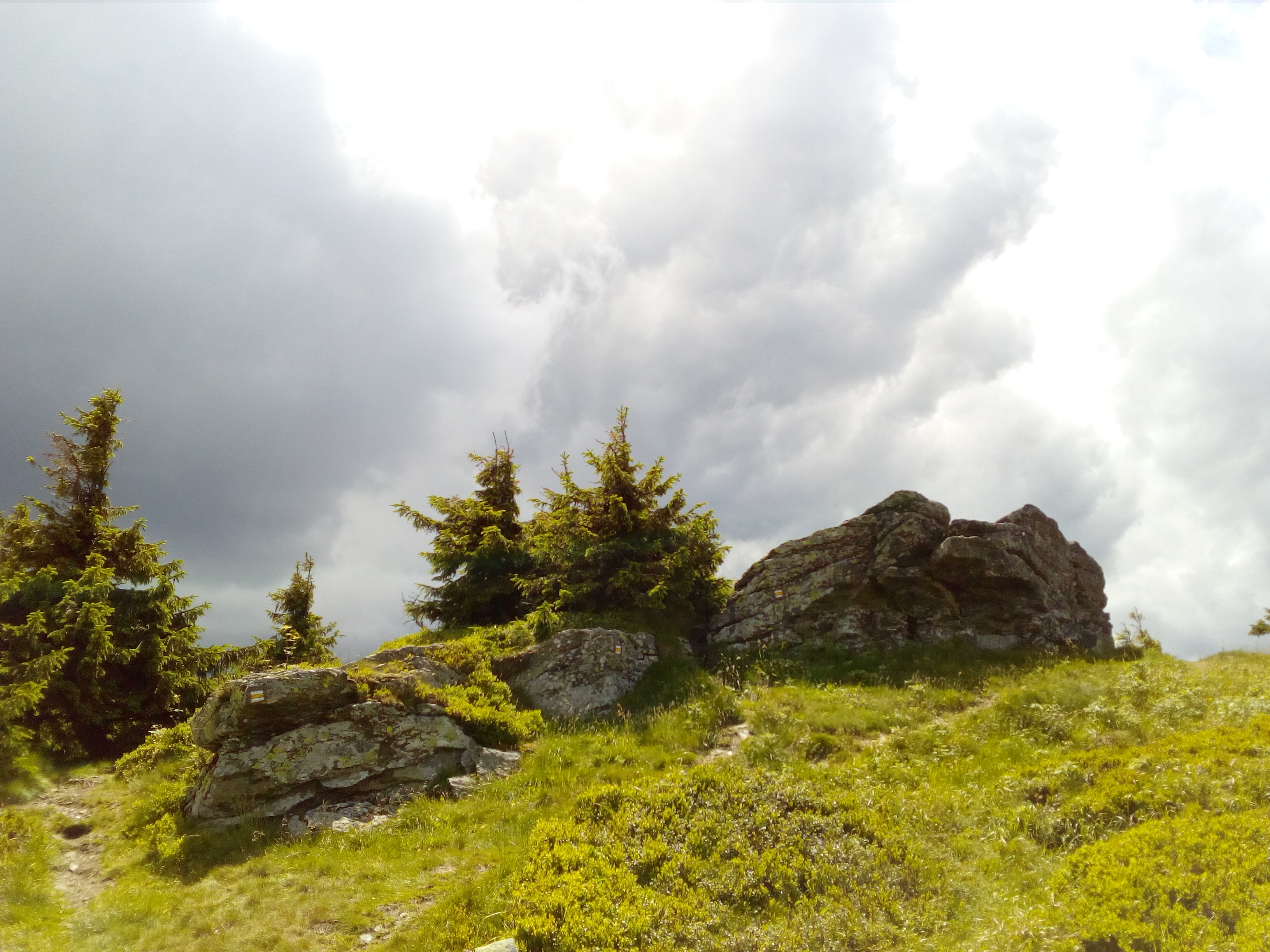 Zamířila jsem tedy ještě i na Keprník a Šerák, kde jsem si dala pauzičku, ale jen venku před chatou. Celkem bylo dost turistů, ale naštěstí tento hřeben je ještě v pohodě oproti Pradědu. Když jsem se vracela zpátky směr Keprník, už jsem potkávala lidi podruhé. Nějaké turistky středního věku se hned ptaly jestli trénuji na ten maraton. 😀 A i ostatní mě povzbuzovali. Asi jsem i dobře pila a jedla, jelikož energie neubývala. Tak jsem si vyšlápla ještě na Červenou horu. To už se počasí kazilo a spadlo těch pár kapek, takže jsem si vyslechla i poznámku, jestli utíkám před deštěm. 😀 Z Červené hory jsem se už na Vřesovku nevracela ale běžela rovnou na Bílý sloup a dolů nad Červenohorské sedlo. Cestou se trošku víc rozpršelo, turisti s dětmi měli už i pláštěnky, ale stačilo kousek popoběhnout a byla jsem pryč z mraku. Navíc mě to bavilo, déšť příjemně osvěžoval. Nad ČH sedlem jsem udělala otočku o 180 stupňů a pokračovala zpátky přes sjezdovku ale po lyžařské, která vede o vrstevnici níž a napojuje se na zelenou značku pod Šindelnou horou. Také mě tam povzbudili další turisté, tentokrát kluk s holkou, keré jsem už potkala u Vozky, a kteří zas hned uhodli, že jsem byla až na Šeráku, a ještě mi zatleskali. 🙂
