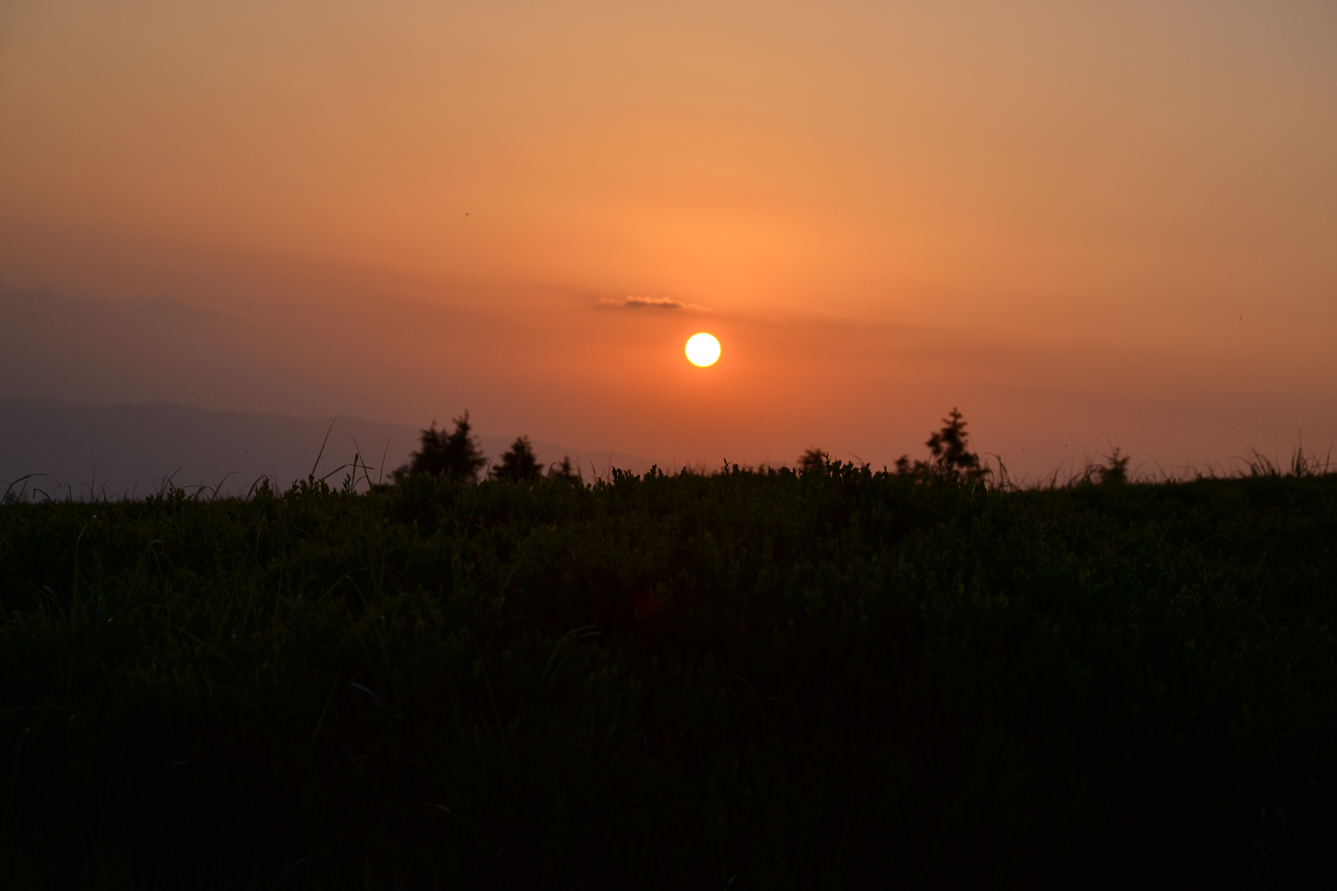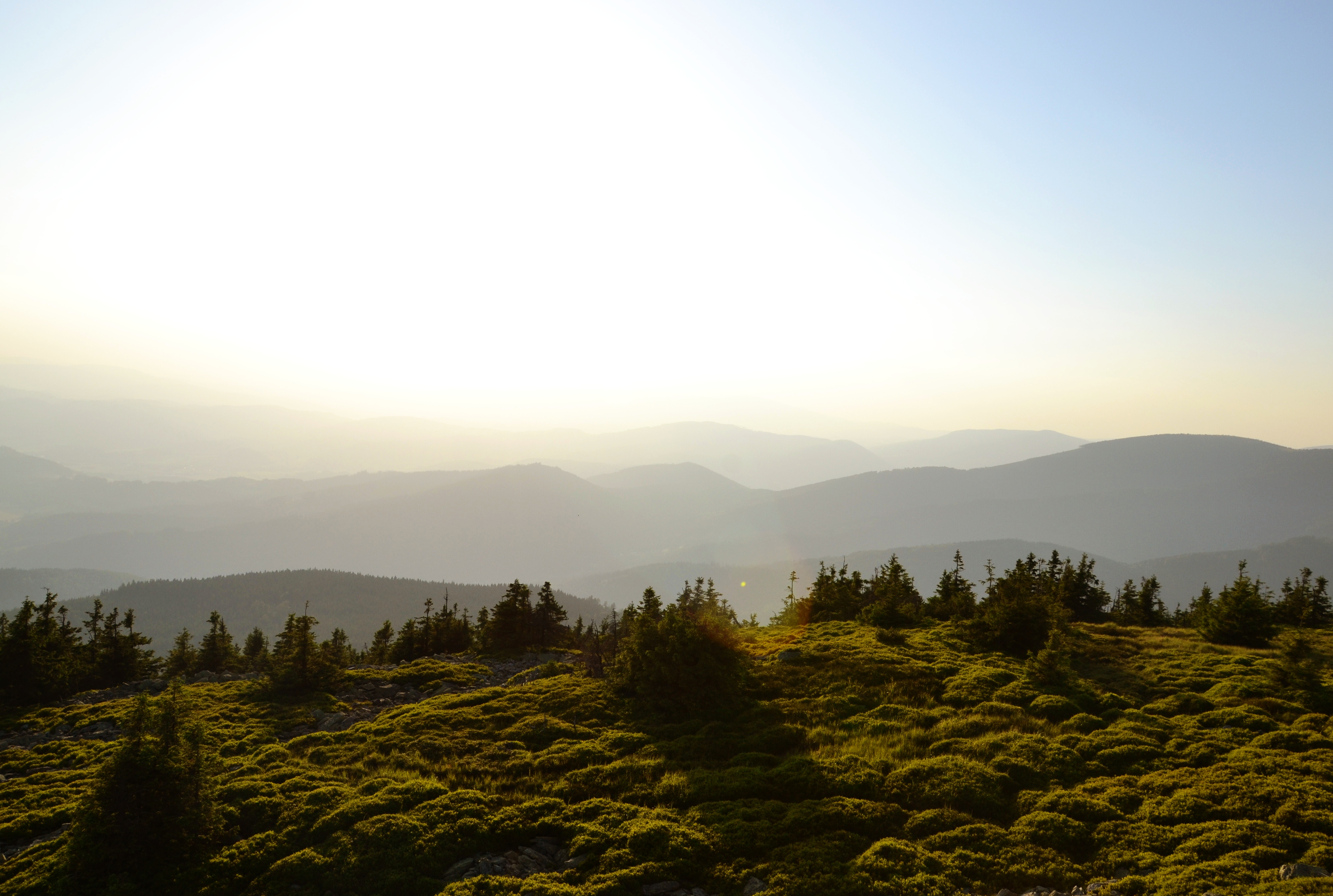 Na Jelení studánce bylo už obsazeno, ale tak nějak jsem s tím počítala. Starší chlapík pokračoval dál a mladší mi hned nabízel placatku se slivovicí a prorokoval, že dnes určitě ještě někdo přijde. Já ale potřebovala na vrchol Pecný, což není daleko, tak jsem s díky odmítla, ujistila ho, že se ještě vrátím a rychle šla dál. Po cestě už jsem samozřejmě potkala ty, kteří vylezli večer jen ze Skřítku nahoru a také se chystali na Jelence přespat. Když jsem se vrátila, bylo už u chatky a pramene rušno. Kromě mě a Tomáše (borec s placatkou) tam byli učitelé z Bruntálu s dětmi, které se dobrovolně přihlásily na dobrodružný výlet do Jeseníků. V chatě se ubytovala partička asi o pěti dospělých a dvou dětech, která dorazila jako poslední, a my ostatní jsme si poskládali spacáky do řady vedle na trávník. I když jsem nejdřív slivovici odmítla, po zhodnocení mé únavy a večerní dobré nálady, jsem si nakonec taky dala. No, spíš jsem jen tak olizovala placatku, jestli to byl nakonec panák, tak to bylo hodně. Na žízeň jsem dostala pivko a po večeři jsme se houfně sebrali za kopec pozorovat západ slunce a fotit.