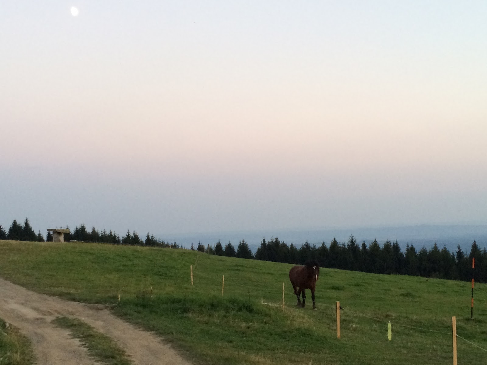 | Další romantika, koníček, v dálce kopce, soumrak U Šámalů. V otevřené krajině je ještě docela vidět, ale v lese už je fakt tma jak v lese. |