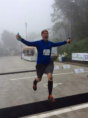 Jestli jsem si myslel, že tu závěrečnou sjezdovku dám ve svém proslulém seběhovém tempu, rychle se vyvádím z omylu. V naražených kolenou necítím tu jistotu, kopec je velmi prudký, tráva se smeká, prostě všechno špatně. Cestou dolů jsem mohl sundat pět, v lepším případě i deset minut, což by mě ve výsledku posunulo o deset až dvacet míst. Tak nahusto to nakonec bylo. Jenže je taky hustá mlha a i když nakonec doběhnu 12 sekund za dalším závodníkem, nikoho před sebou nevidím. Po pravdě, ani nevidím značky trasy, dokud nejsem dva metry od nich. Tak jsem na sjezdovce opatrnější a řádně přidávám až na polňačce, kterou vletím na cílovou cestu. Končím v čase, který neběžcům nic neřekne (2:47 na 22 kilometrů) a na pozici 109 ze 143 běžců. Poslední běžec, jehož jsem si o pár desítek minut později při postávání před cílem a povzbuzování dobíhající všimnul, skákal na jedné noze a odrážel se hůlkama jako berlema. Ukázalo se, že si na třináctém kiláku vyvrtnul kotník, ale závod si tím nechtěl kazit, akorát ten seběh dolů, to už to fakt dost bolelo a musel skákat po jedné. Sklidil potlesk, protože seskákat sjezdovku po jedné, to nikoho jiného nenapadlo, přitom to zní jako moc zajímavý nápad. A končit závod kvůli vyvrtnutému kotníku, to by přeci taky nikoho nenapadlo.