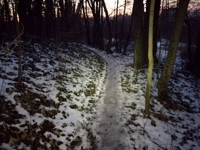 Přes Hutě (tywe, prvně v životě tady!) jsem proběhl do Satalic, to už jsem přeběhl i Vysočanskou spojku a v Satalicích se dostal do bažantnice, odkud už to znám, je to stará vesta Projektu Černý Most. To už se začalo stmívat a tak jsem vytáhl čelovku a běžel s ní. Dlužno dodat, že právě celé Satalice až do vinořské obory byly po zledovatělém sněhu, na němž stála vrstva vody, byl to asi nejpomalejší úsek cesty, protože to fakt nešlo běžet rychle a když jsem z jednoho kopce dvacet metrů klouzal dolů, neviděl jsem to moc dobře. Nakonec jsem všechno ustál bez pádu a výhodou bylo, že počasí nelákalo ven pejskaře, takže i bez problémů se psy. Ovšem když na ledu běžíte mírný trail, tak je to … inu, zábava.