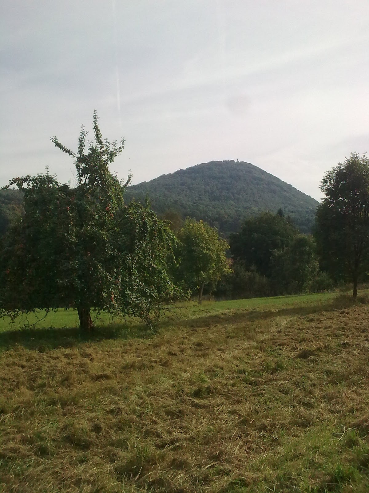 Kolem stojí stohy slámy a před námi – Milešovka! Ta je krásná! 🙂 Vůbec nevypadá hrozivě. Třeba jí možná dneska ještě nakonec pokoříme.