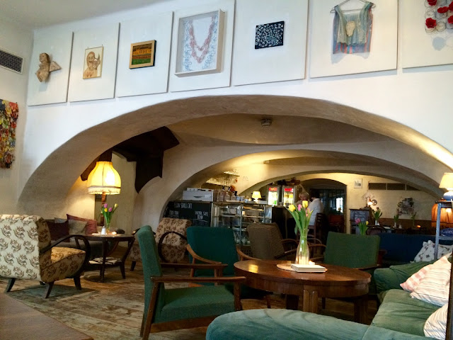 Uvnitř se uvelebíte v pohodlných křeslech, každé je jiné. Připadáte si jako v obýváku nějakého známého malíře, na stěnách visí abstraktní malby, zajímavé fotografie, obklopují vás starožitné skříně, sošky a květiny.