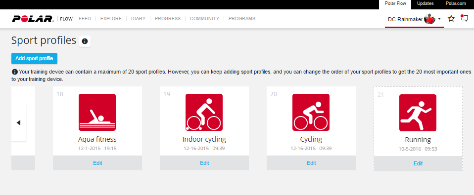 The only downside here though is that Polar only allows you to configure/add/change these sport modes on Polar Flow, so you’ve gotta go online to do that.  It’s here that you can select which sport modes, and the specific data pages within those: