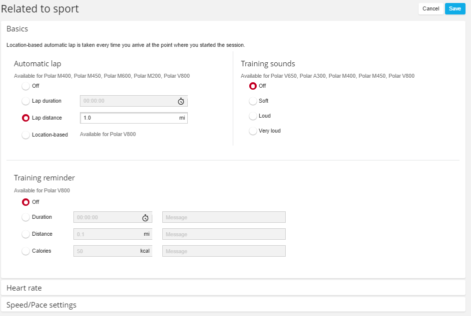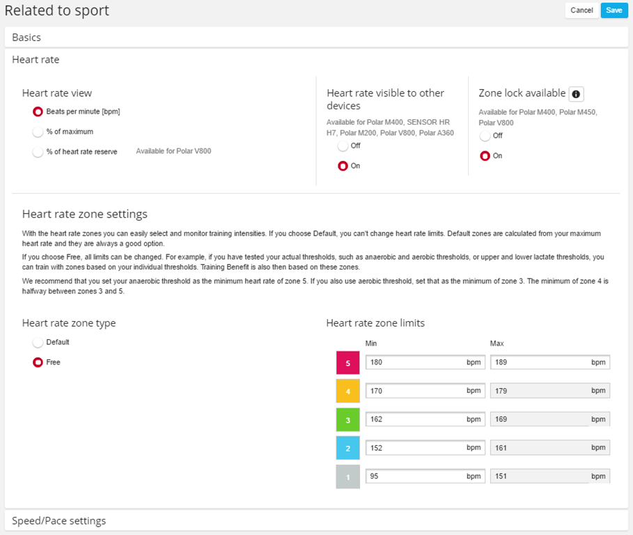 You’ll click on a given sport to customize it or the data pages within it.  This includes settings like automatic lap options, heart rate zones, and pace/speed metrics.