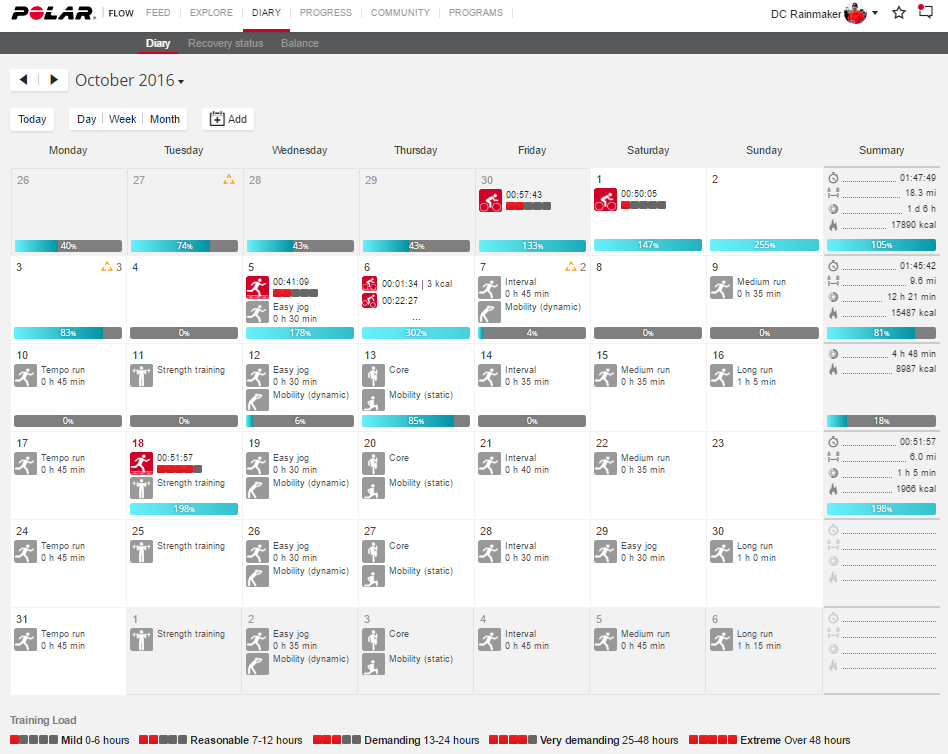 It’s on Polar Flow that you can also setup training plans.  These plans include things like plans for 10K races, which will include not just running workouts, but also core workouts in between the running days.  Further, it’ll populate the calendar online as well as the scheduled workouts on your wrist.  The grey ones below are the scheduled ones.  The red ones are the completed ones.