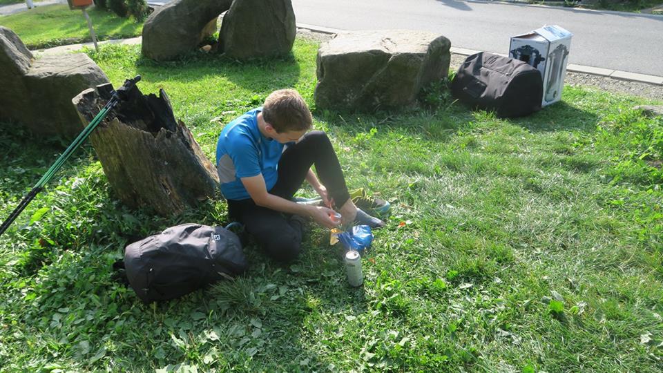 Na venkovní občerstvovačce v Ramzové sundavám boty. Nový pár, který mám otestovaný pouze v rovinách v Polabí, se v kopcích lehce zařezává do achilovek. Raději obě nohy přelepuji. Udělat se mi na nich bebíčka, tak už tuhle akci asi zabalím. Operace zafunguje. Obsluhují to tu Martin Fojtík s Luckou Brokešovou, stovkařští matadoři. Sedím na trávě a vychutnávám si příjemnou atmosféru, jenž tu vytvořili. Přibíhají Tonda s Jirkou a Ondra Plašil. Za posledním jmenovaným se pouštím do stoupání na Šerák, ale ještě dole u Vražedného potoka mi utíká. Jak jinak, že jo? 🙂