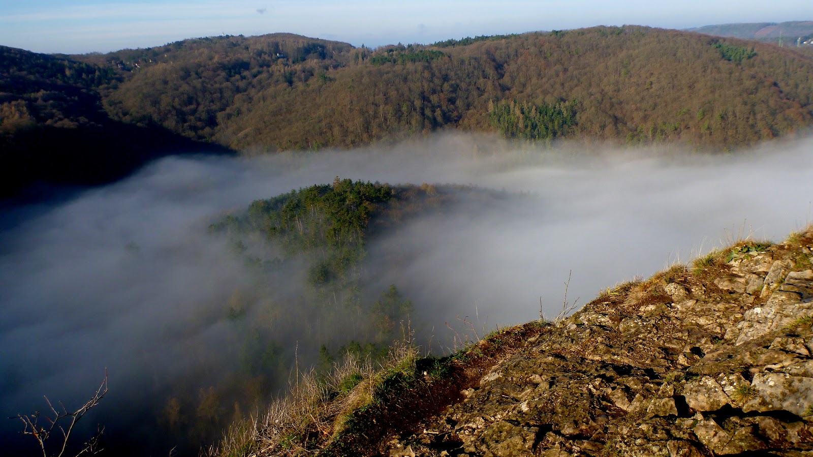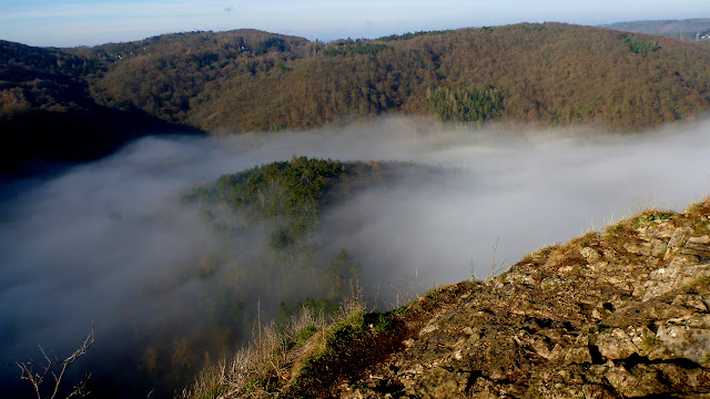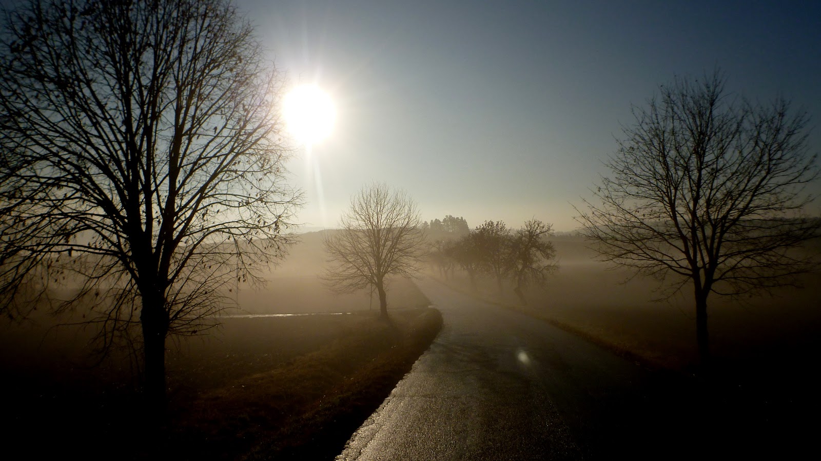 Rozhlednu na vršku zalévalo ranní slunce, ale klesáním po silnici se vracím zpět do mrazivé mlhy inverze. Namrzlá silnice pěkně klouže, zatímco mlha se sluncem vytváří nádherné scenérie.