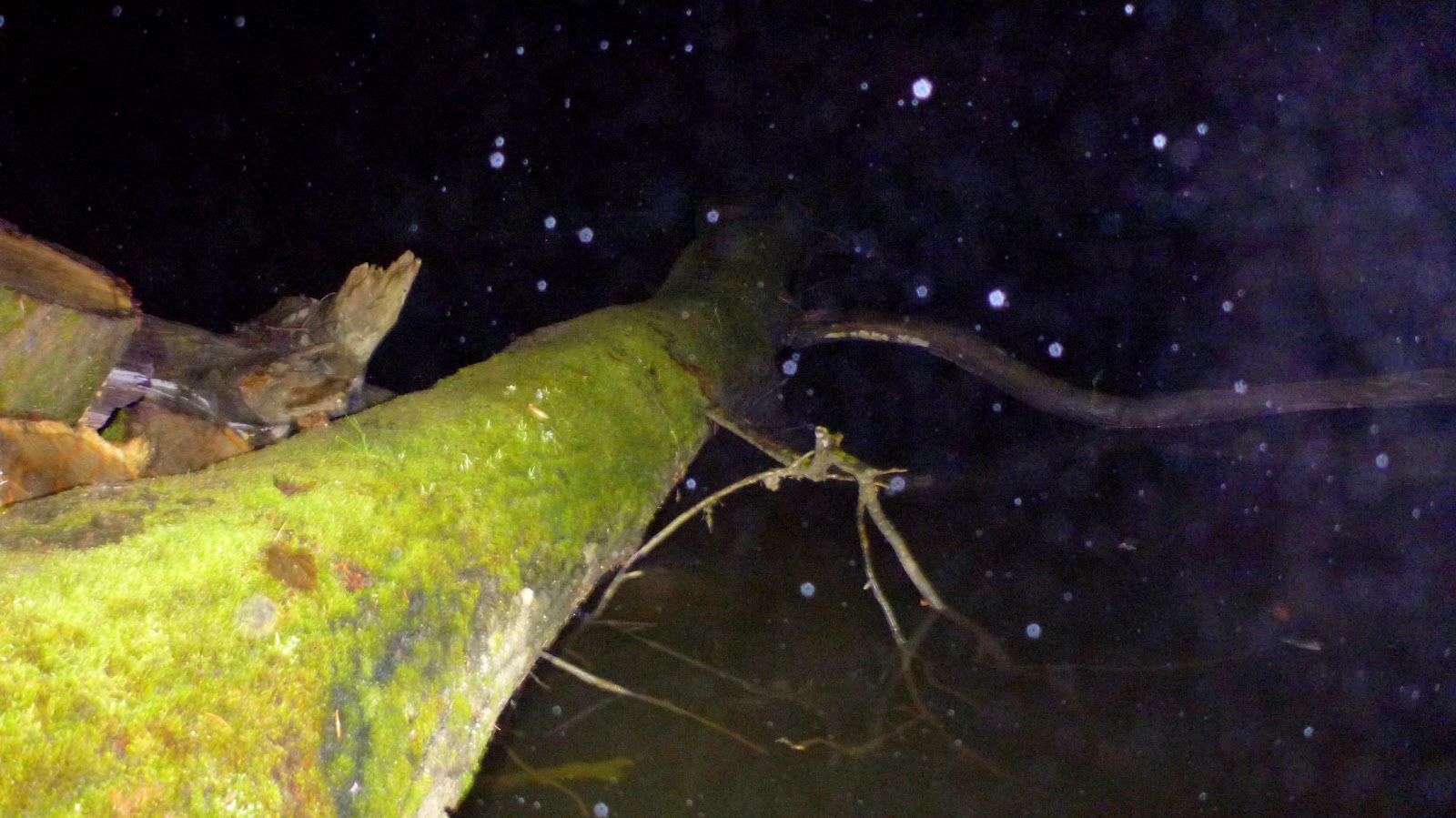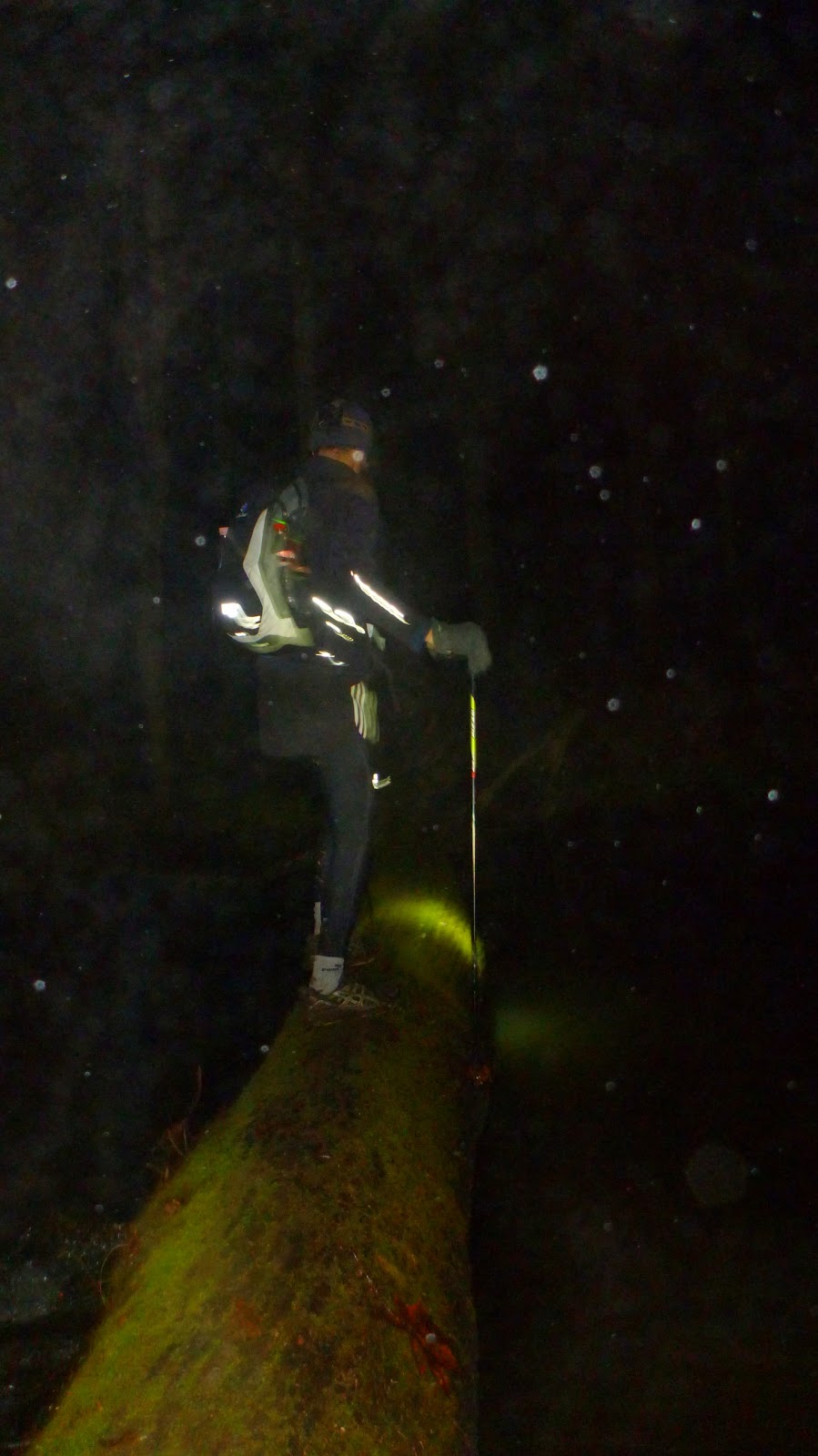 Běžíme dál, Gábor drží skvělé tempo, když v tom se nám přes cestu objeví říčka, přes kterou leží padlý strom. Cesta dál vede samozřejmě přes něj. Díky Olafe! Gábor má hůlky, takže jde neohroženě vpřed přes strom. Já hůlky nemám. Chvíli se ostýchám, zda to nepřelézt raději po čtyřech. Vykoupat se ve studeném potoce bych se opravdu nechtěl. No nic, jdu normálně vestoje a nakonec to není tak hrozné, takže zvládám v půlce i selfíčko na památku.