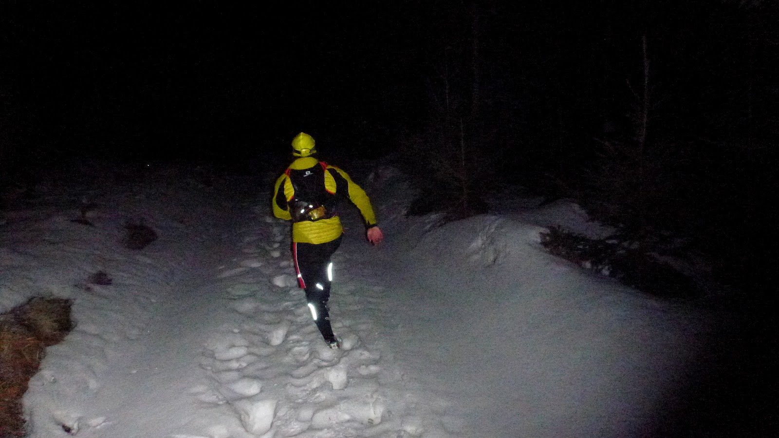 Nakonec se vydáváme po té cestě zpět a ta nás dovede zpátky na zelenou značku, kde už svítí čelovky ostatních, co nás mezitím dotáhli a to jsme museli mít slušný náskok. Nyní už dobře po zelené dojdeme na Stropník, kde nám označí živá kontrola výkaz a mažeme dolů. Jenže ve spěchu míjíme odbočku a tak běžíme dál v protisměru to, co už jsme běželi.