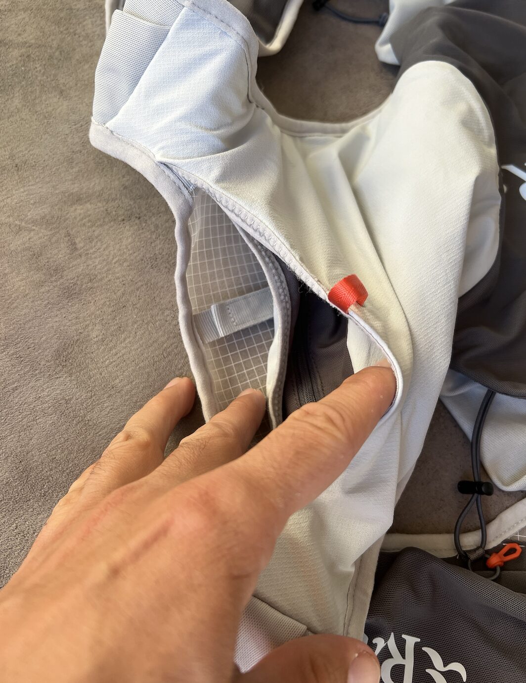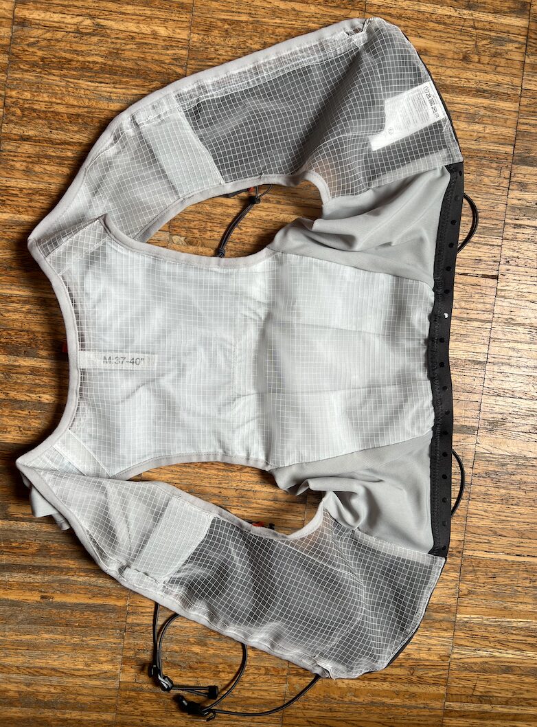Vesta je vyrobena z na dotek i pohled opravdu zajímavého materiálu Ripstop Mono Mesh. Je hladký, odolný a průhledný s diagonální pružností – tedy pouze v těch směrech, kde je to skutečně potřeba. To minimalizuje poskakování nákladu při vertikálním pohybu. Boční panely z jemné pružné síťoviny zvyšují prodyšnost a přizpůsobení tělu, zatímco materiál neabsorbuje pot, chrání obsah před vlhkostí. V teplém počasí to však může vést k menšímu komfortu, protože pot se nesákne do vesty, ale zůstává na kůži. Další detaily zahrnují malou karabinu pro uchycení klíčů, reflexní prvky pro lepší viditelnost v šeru, integrovanou píšťalku na hrudním popruhu, což je standard pro horské vybavení.