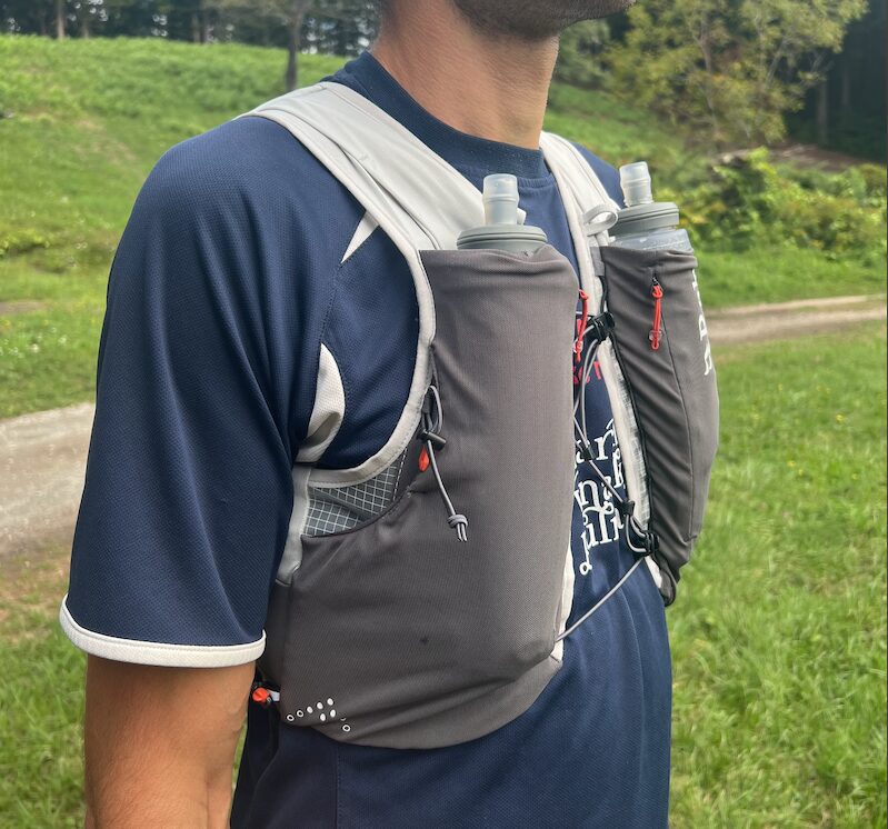 Základní koncept je jako u každé standardní vesty. Na přední straně jsou kapsy pro dvě 500 ml měkké lahve (součást balení). Každá má elastickou kapsičku na snacky nebo gely a také druhou např. na telefon uzavíratelnou kvalitním YKK zipem (dali jsme tam pohodlně i 6palcový displej). Na zádech je rozdvojená kangaroo kapsa pro oblečení, jídlo nebo 2L hydrovak (prodává se zvlášť). Hole lze upevnit dozadu nebo vpředu pod popruhy, i když si dovedeme představit, že vepředu to může někomu při běhu překážet.