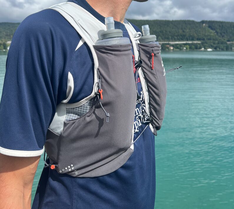 Hydratace je flexibilní – láhve umožňují pití za běhu téměř bez rukou, i když pohodlnější je láhev zespoda přidržet. Doporučujeme naučit se pít tak, aby se minimalizovaly vzduchové bubliny, protože ty někdy způsobují nepříjemné poskakování. Celkově pojme vesta až 3 litry vody (lahve + vak), což stačí na několikahodinové aktivity. Pro nás bylo důležité vyvážení hmotnosti: plné lahve vpředu bez zadního zatížení vedou k takové zvláštní nerovnováze. Možná je to ale jen náš nezvyk.