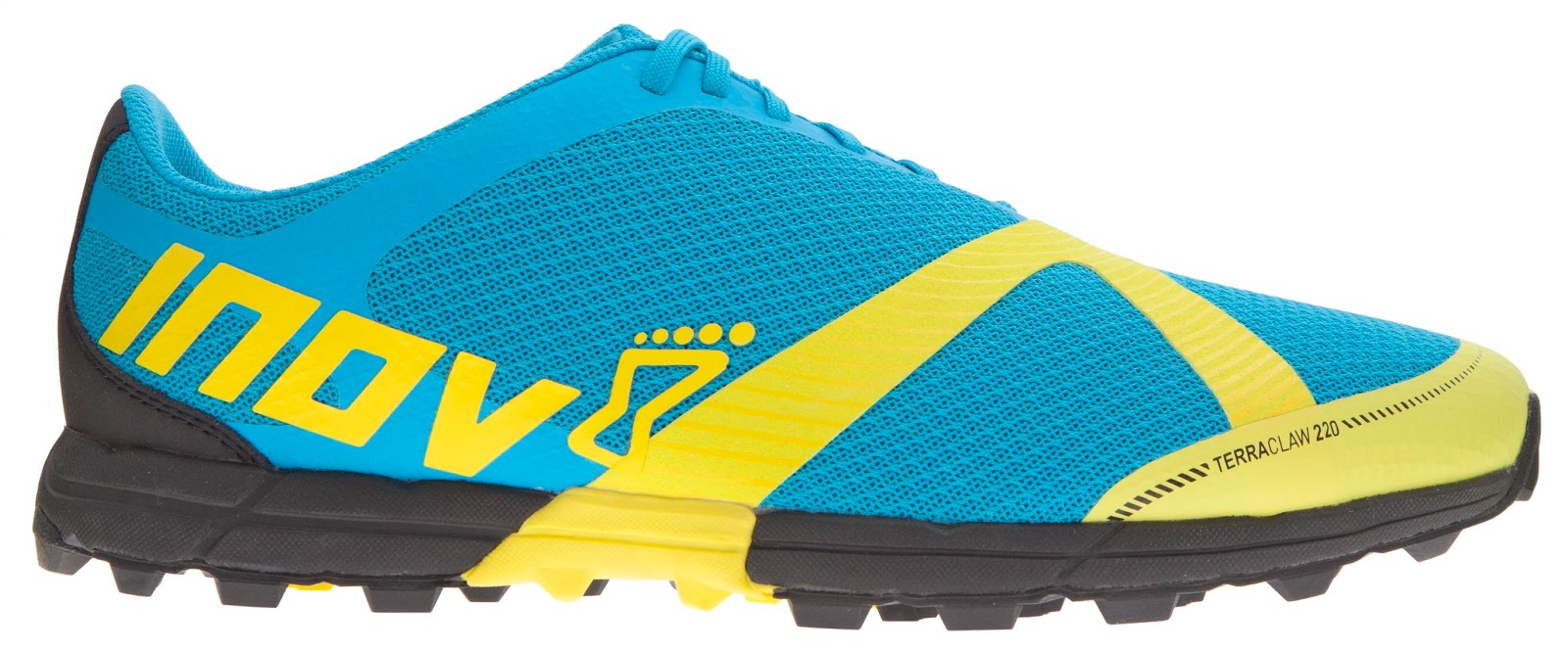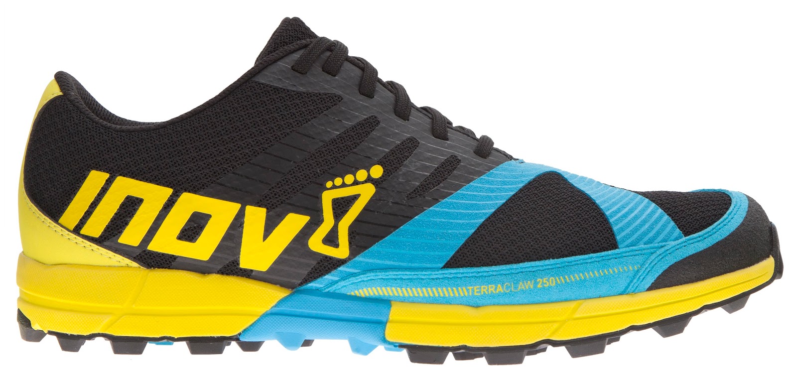 Vyšší 250ka má „vysunuto“ šněrování o cca 15mm výše oproti ostatním botám, bota tak drží na nártu a příčná klenba má krásně neomezený prostor k přirozené práci. Asymetricky našitý „zámek“ na jazyku s průvlakem na šněrování zafixuje jazyk v konstantní pozici a nedochází tak k jeho rotaci kolem nártu ani při nejtěžších traverzech. Prodyšný svršek zpevňuje kontrastní syntetická výztuha ve tvaru X, která drží chodidla v lůžku boty při běhu v těžším terénu. Obsázka kolem celého obvodu boty také napomáhá k fixaci chodidel v botě a zároveň ochraňuje okraje chodidel před kameny a dalšími nástrahami terénu. Špička je pak ještě vyztužena proti nakopnutí různých předmětů, jako jsou kameny, klacky, atd. Tradičně měkkčí opatek je citlivý k patám a achilovkám, a dá se částečně tepelně aktivovat v případě nějakých anomálií na chodidlech (výrustky, atd). Střih kolem kotníků je o cca 5mm vyšší něž třeba u modelu RACE ULTRA a v kombinaci s vyšším šněrováním je docíleno lepší fixace kotníku v botě. Jako jedna z mála bot v nabídce INOV-8 nemá TERRACLAW poutka na kotníkový návlek (RACE ULTRA GAITER), nicméně lze zde bez problému použít návlek DEBRISGAITER.