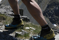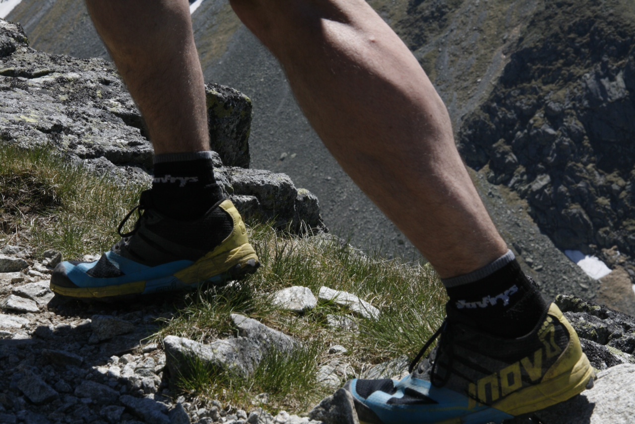 Obsázka kolem celého obvodu krásně drží chodidla v lůžku boty a navíc je svršek diagonálně vyztužen kontrastním X. Tyto drobné detaily oceníte v těžkém terénu a v traverzech. Testovaná verze měla obsázku s výztuhou z navařeného TPU materiálu, na který byla následně nalepena gumová výztuha špičky a jako celek byla dokonalá, geniální, skvělá, úžasná,… Protože se ale některým testerům během použití objevilo na spojích TPU materiálu s meshovým materiálem svršku drobné třepení, bylo rozhodnuto, že pro průmyslovou výrobu se TPU výztuhy nahradí poddajnějším syntetickým materiálem (změna k lepšímu), na který ale bohužel nelze aplikovat gumovou výztuhu špičky (změna k horšímu). Špička je tedy vyztužena jen gumovým polepem, podobným, jako byl u Trailroc 255. České horské prostředí nenabízí tak těžké podmínky, kde by tato výztuha špičky nějak limitovala použití. Jediný pocit diskomfortu jsem vlastně zažil jen při sbíhání suťoviště v Roháčích.