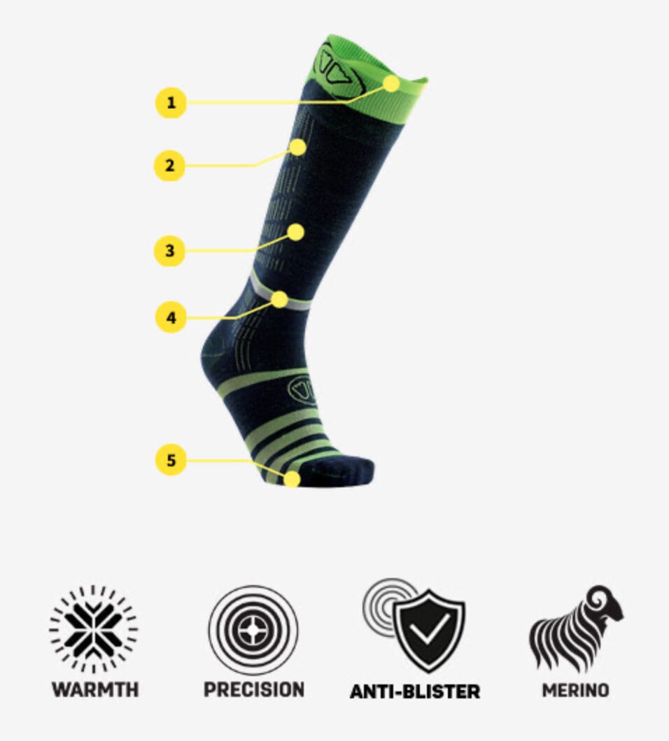 Tohle jsou ponožky, které bych doporučil všem, kdo mají lyžáky řešené přesně – Strolz, bootfitting, tvarovaná botička, vložky na míru. Proč? Protože v botě na míru nechceš „ponožku navíc“. Chceš vrstvu, která nic nepřidá, ale přitom dá komfort a ochrání kůži.