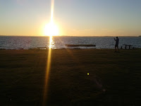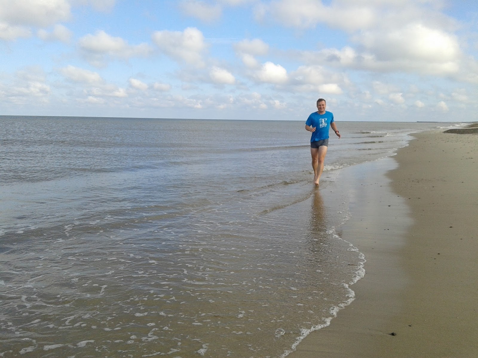Osvěženi koupelí běháme po pískové pláži – na zahřátí  není nic lepšího. Když se chceme obout, zjišťujeme, že zbavit se drobného písku není jen tak, před závodem tak budeme muset ještě pořádně nohy očistit. Sbíráme kamínky a užíváme si nádherný den. Našel jsem i pravou dětskou zábavu skákat do jemného písku z vršku duny dolů, nádhera baví mě to jako malého Jardu, člověk letí dva metry a pak se zaboří po kolena do jemného písku. Má to malou nevýhodu, že boty jsou pak plné písku, ale co. Odpoledne si uvaříme pozdní oběd a narveme se špagetama co to jde, pravá předzávodní pasta party.