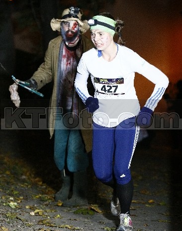 Ve velmi prudkém kopci znovu přecházím na pár kroků do chůze. Atmosféra nočního Vítkova nemá chybu. Fouká vítr, kolem šustí zlatavé listí v korunách stromů. Vše dokresluje podmanivá hudba doplněná výkřiky. O dokonalých maskách a kostýmech ani nemluvě. Jsem z tohohle závodu naprosto nadšená :-). Je to pecka!